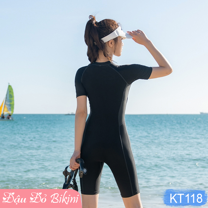 - Mẫu đồ bơi áo tắm dành cho các bạn gái thích dáng kín đáo nhưng vẫn trẻ trung, năng động. - Dáng quần short (đùi) thể thao, áo thun cộc tay kèm khoá kéo