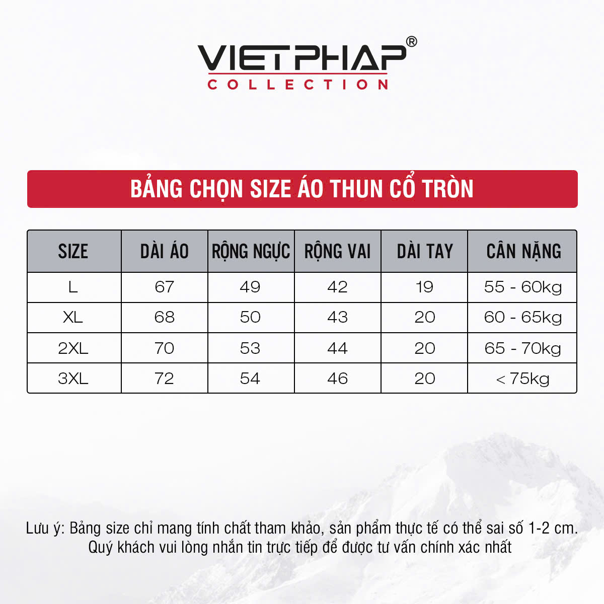 - Đổi trả hàng theo đúng quy định của Tiki VietPhap Collection Sản xuất tại: CTY TNHH May Mặc – Thời Trang Việt Pháp Cùng bạn làm nên phong cách! LƯU Ý: - Bảng size chart chỉ mang tính chất tham khảo, tùy thuộc vào số đo cơ thể mỗi người và chất liệu vải khác nhau sẽ có sự chênh lệch nhất định từ 1 - 2cm.
