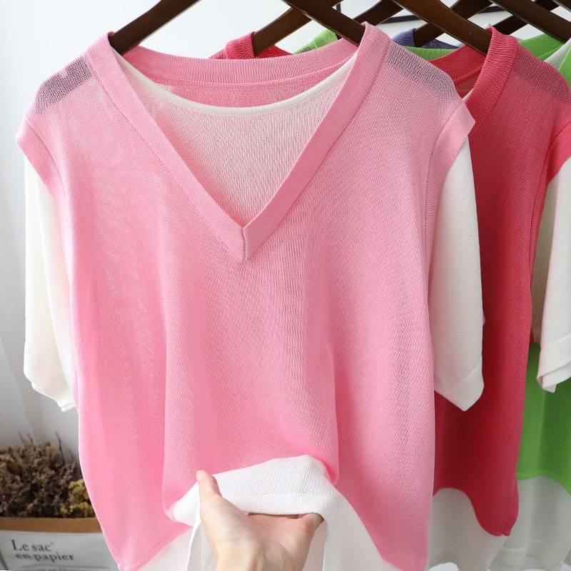 ✨áo thun nữ hai mảnh vải mỏng len dệt kim ngắn tay freesize
