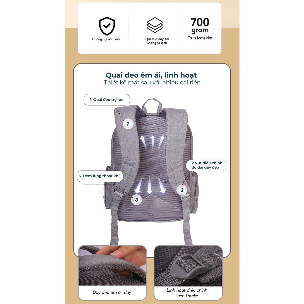 TÍNH NĂNG SẢN PHẨM ️Ba lô toàn diện với đệm mút dày êm giúp chống xô lệch, quai đeo trợ lực, đệm lưng thoát khí, nút điều chỉnh độ dài dây đeo, dây cài ngực. ️