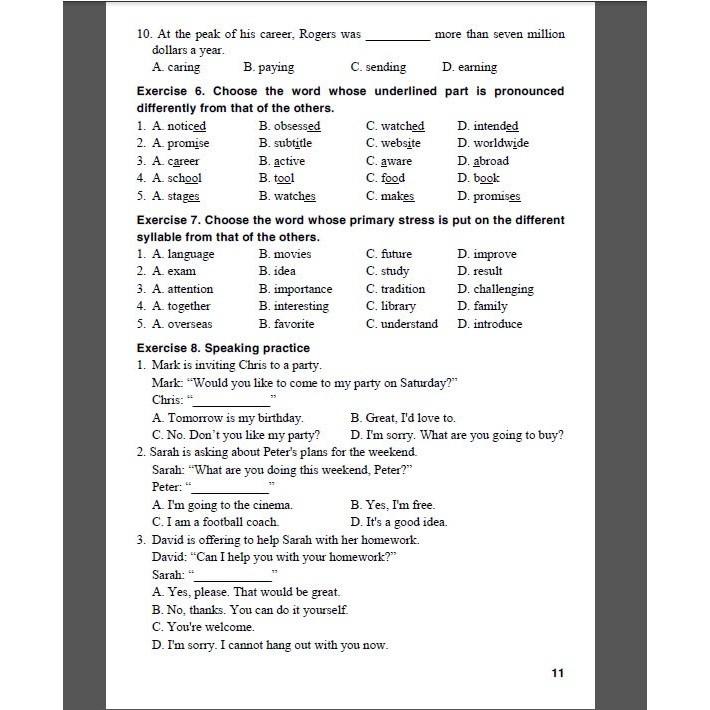 V. Practice Tests: Cuối mỗi Unit, chúng tôi biên soạn hai Practice Tests gồm nhiều dạng câu hỏi khác nhau với cả hai hình thức trắc nghiệm và tự luận. Mục đích các bài Practice Tests này nhằm giúp học sinh củng cố và nâng cao kiến thức từ vựng và ngữ pháp đã học trong mỗi Unit.