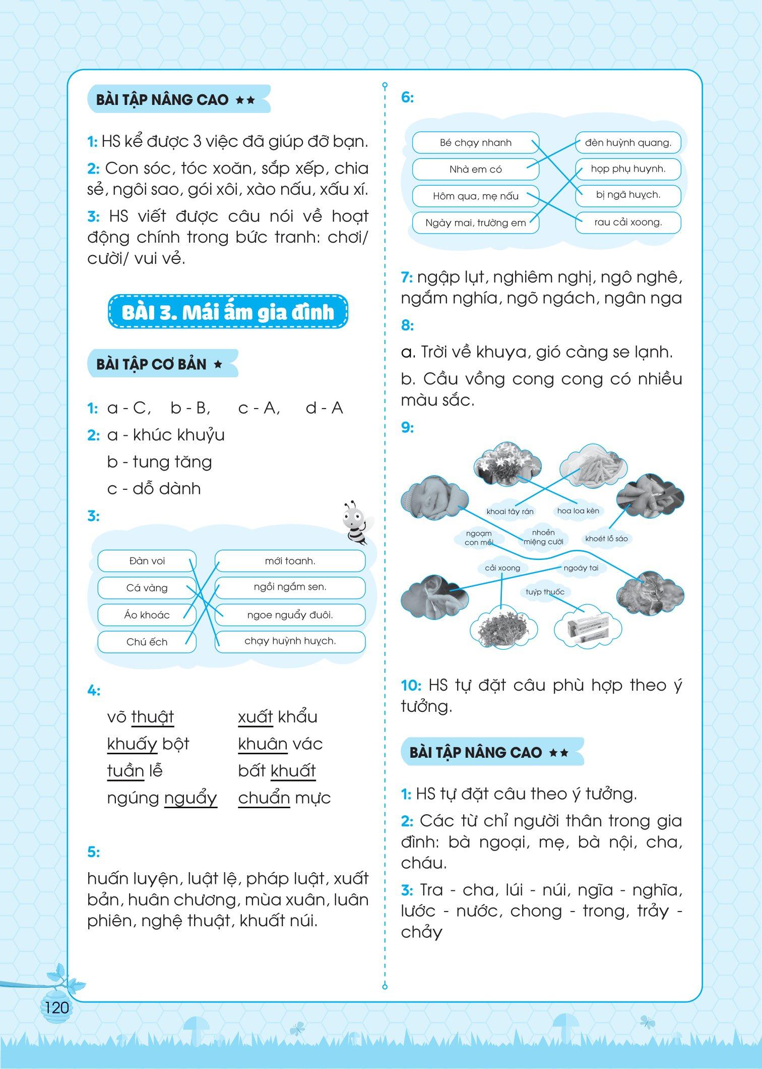 - Bài tập cơ bản Các bài tập trong phần này được thiết kế sinh động, đầy cảm hứng với rất nhiều các hoạt động nối, tô màu, gạch chân, giúp khơi gợi hứng thú học và làm bài tập của các em, đồng thời giúp các em củng cố và nắm chắc các kiến thức đã học.