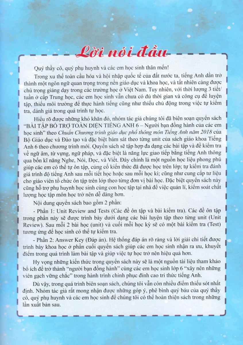 “BÀI TẬP BỔ TRỢ TOÀN DIỆN TIẾNG ANH 6 - Người bạn đồng hành của các em học sinh” theo Chuẩn Chương trình giáo dục phổ thông môn Tiếng Anh năm 2018 của Bộ Giáo dục và Đào tạo và đặc biệt bám sát theo từng unit của sách giáo khoa Tiếng Anh 6 theo chương trình mới. Quyển sách sẽ tập hợp đa dạng các bài tập và đề kiểm tra về ngữ âm, từ vựng, ngữ pháp, và đặc biệt là năng lực giao tiếp bằng tiếng Anh.