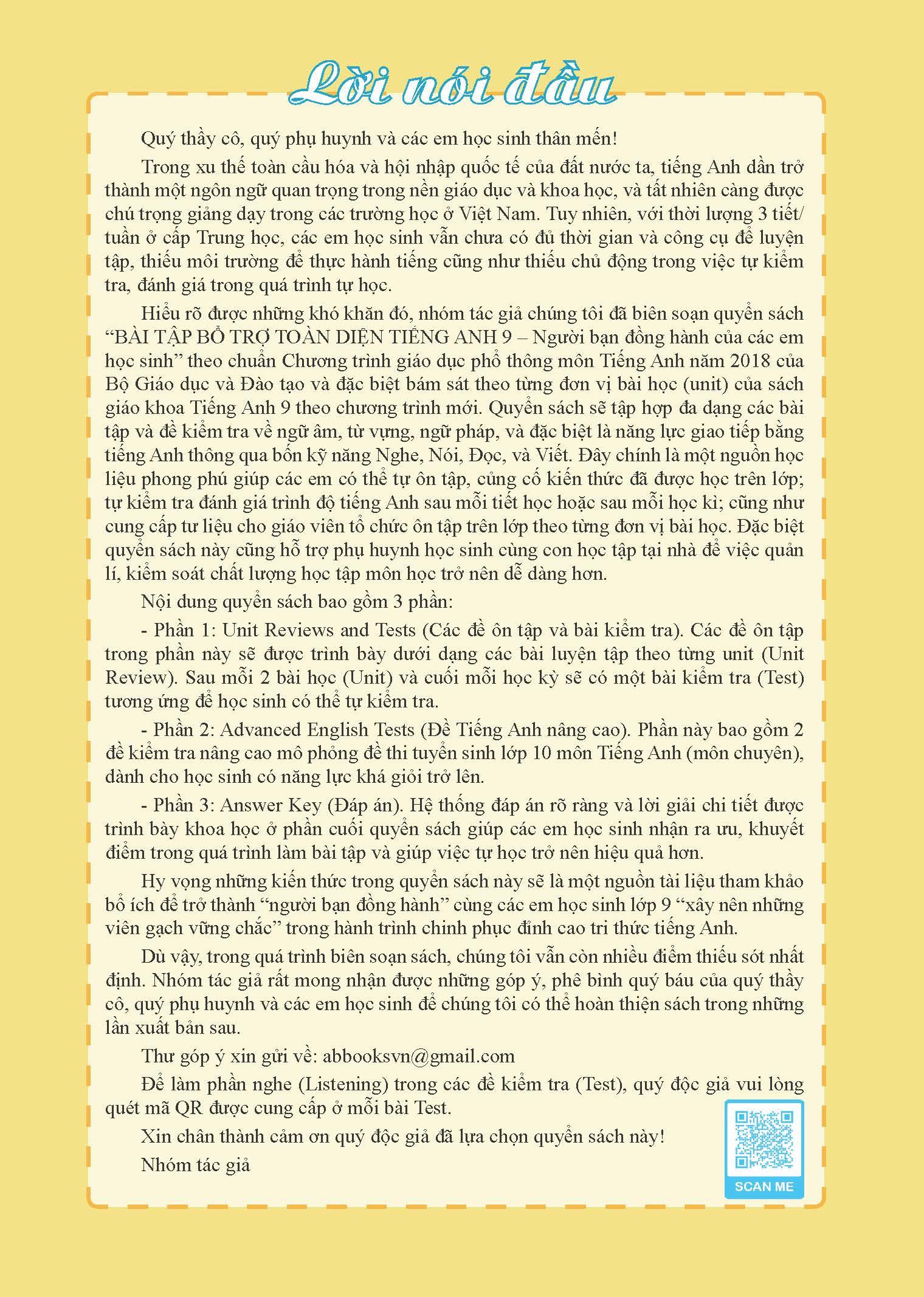 Bài Tập Bổ Trợ Toàn Diện Tiếng Anh 9 - Người Bạn Đồng Hành Của Các Học Sinh Là cuốn sách giúp học sinh lớp 9 củng cố từ vựng sau các bài học trên lớp. Nội dung các bài học trong cuốn sách bám sát với chương trình của BGD, không chỉ giúp bổ trợ mà còn không ngừng mở rộng vốn từ vựng theo các chủ đề cho người học.