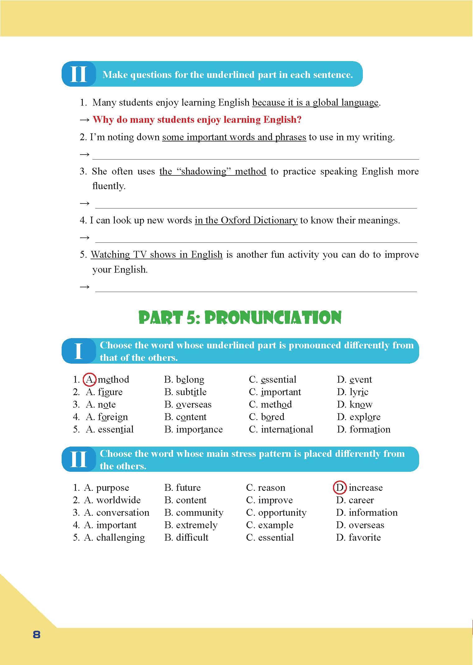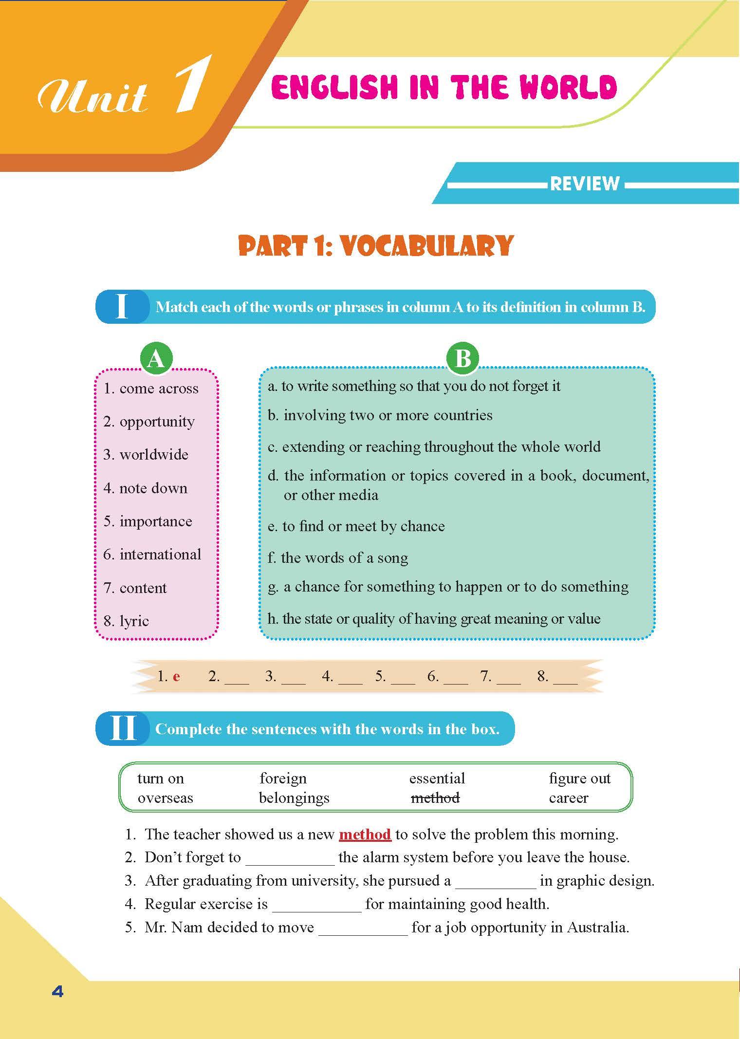Cuốn sách được biên soạn một cách tỉ mỉ theo chương trình sách giáo khoa Tiếng Anh Global Success và được chia thành hai phần chính: phần bài tập cơ bản và phần bài tập