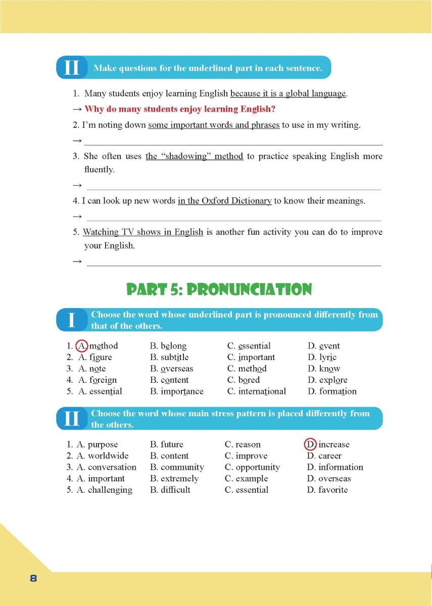 Sách được bố cục theo từng đơn vị bài học, tương ứng với từng Unit trong sách giáo khoa Tiếng Anh 8. Mỗi đơn vị bài học gồm: Từ vựng (Vocabulary): tổng hợp tất cả