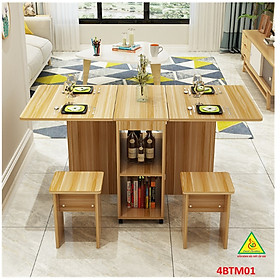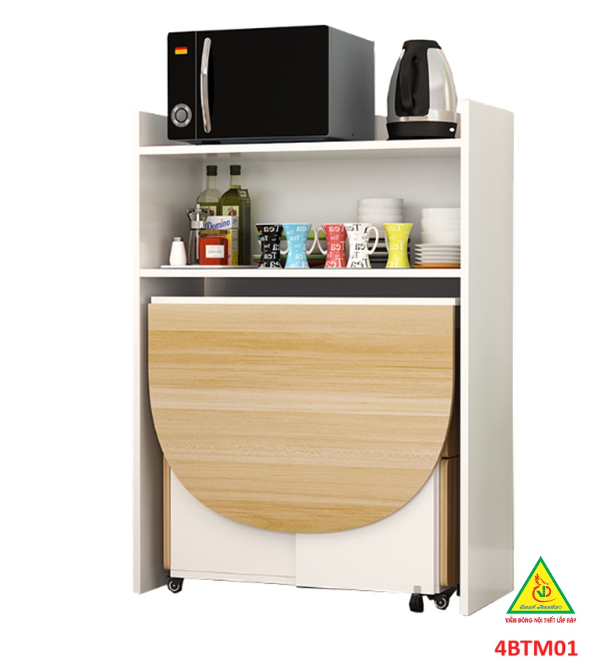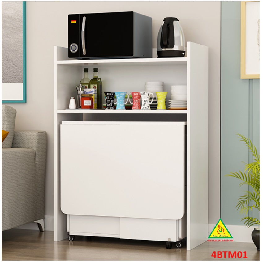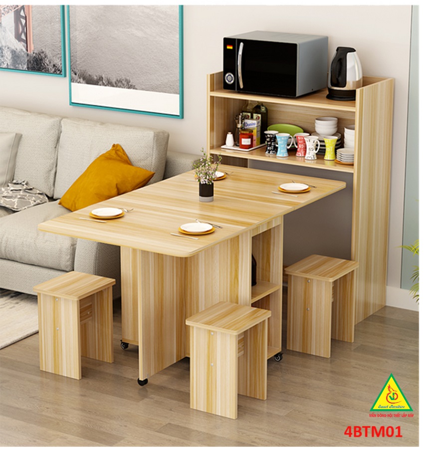 Bàn ăn gấp gọn thông minh Với các gia đình có diện tích phòng ăn không lớn lắm thì Bàn ăn gấp gọn này chính là sự lựa chọn lý tưởng nhất. Bàn ăn có kích thước nhỏ gọn, kết cấu thông minh có thể gấp gọn lại khi không sử dụng tiết kiệm diện tích. Bàn được làm bằng gỗ công nghiệp MDF cao cấp phủ melamine láng mịn, tính thẩm mỹ cao thu hút được sự chú ý của khách hàng. Tích hợp 3 in 1: Bàn, Tủ và Kệ thật Sang - Chảnh - Đẳng Cấp Dù nhà lớn hay nhỏ thì chiếc Bàn Ăn Thông Minh sẽ làm không gian gọn gàng hơn, thoáng hơn và đẹp hơn.