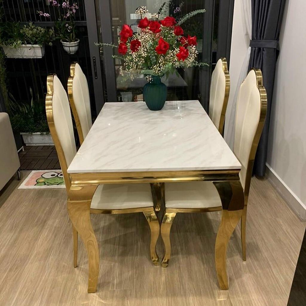 ✨Bàn ăn mặt đá cẩm thạch nhân tạo cao cấp chân inox mạ vàng PVD kết hợp ghế Hoa Mai