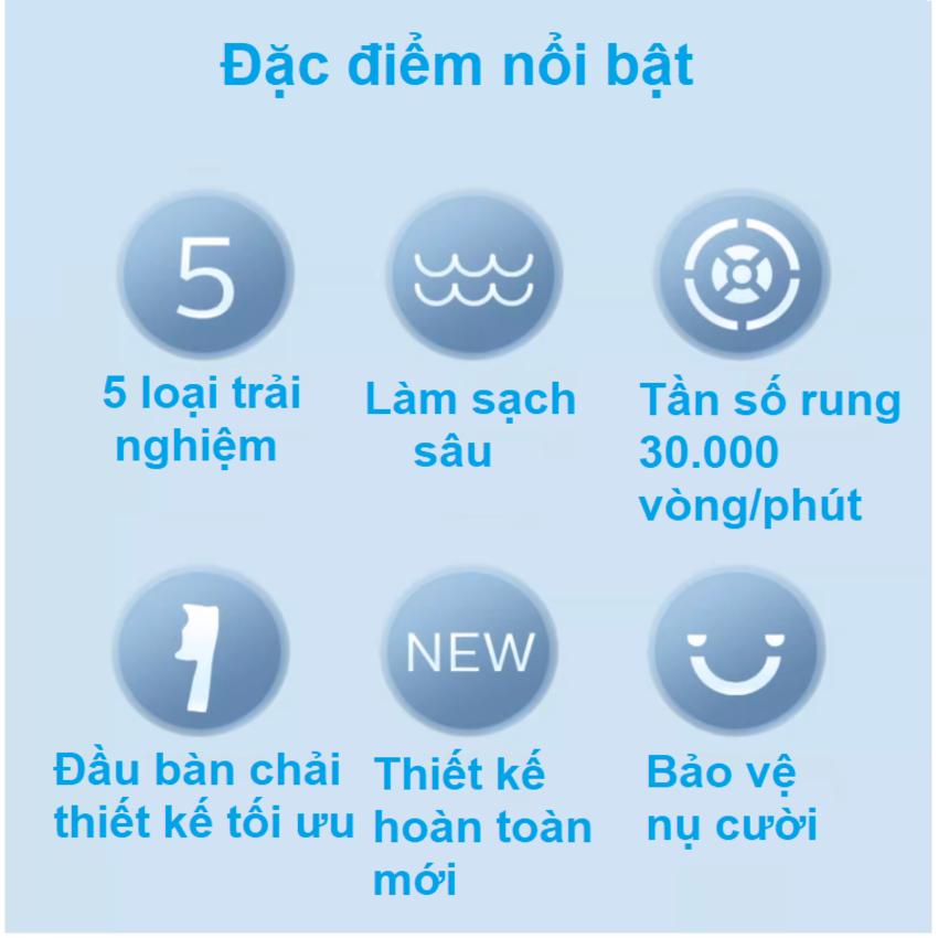- 5 chế độ làm việc: Làm sạch, Làm mới, Làm sáng, Chăm sóc nướu và Chế độ Nhạy cảm
