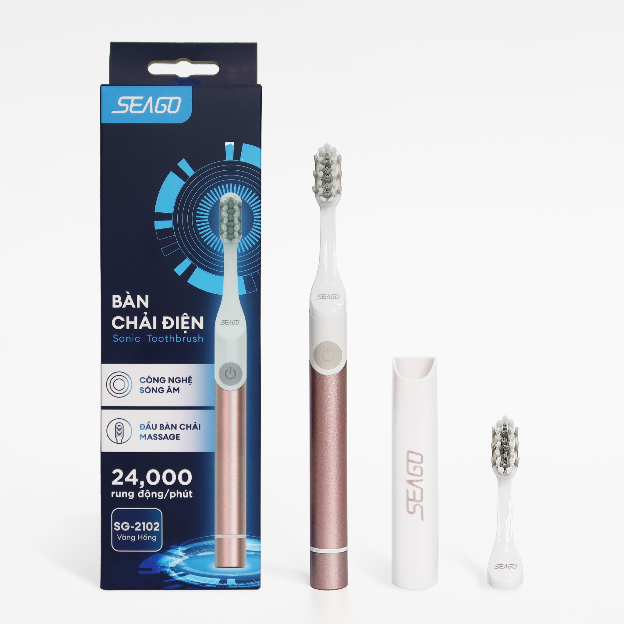 BÀN CHẢI ĐIỆN SÓNG ÂM SEAGO SG-2102 XUẤT XỨ THƯƠNG HIỆU: SEAGO MÀU SẮC: Bạc, Vàng, Hồng MÃ SP: SG-2102 PACKING: - 1 bàn chải điện - 1 đầu bàn chải thay thế