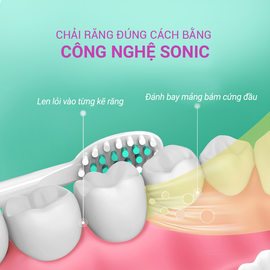 - Theo đó công nghệ Sonic cho phép tạo ra tần số 31.000 lần/phút giúp làm sạch sâu mọi mảng bám mà không gây tổn thương nướu.