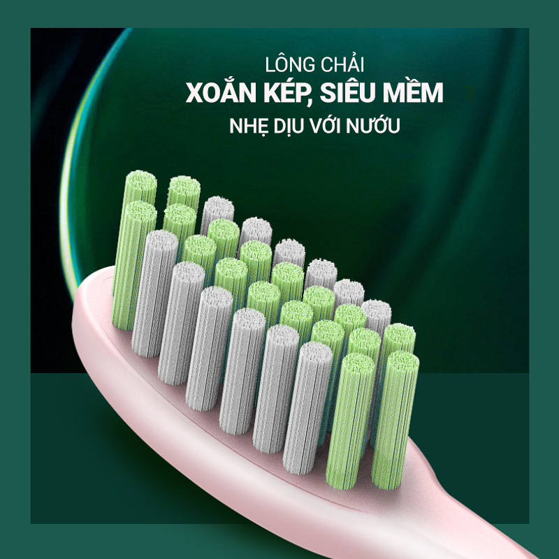 - Bên cạnh đó, đầu bàn chải nhỏ kết hợp với thiết kế lông bàn chải 3D xoắn kép, mềm mại không gây tổn thương cho nướu khi sử dụng, dễ dàng len lỏi vào các kẽ răng làm sạch sâu 5 chế độ đánh răng khác nhau, thời gian theo khuyến cáo nha sĩ