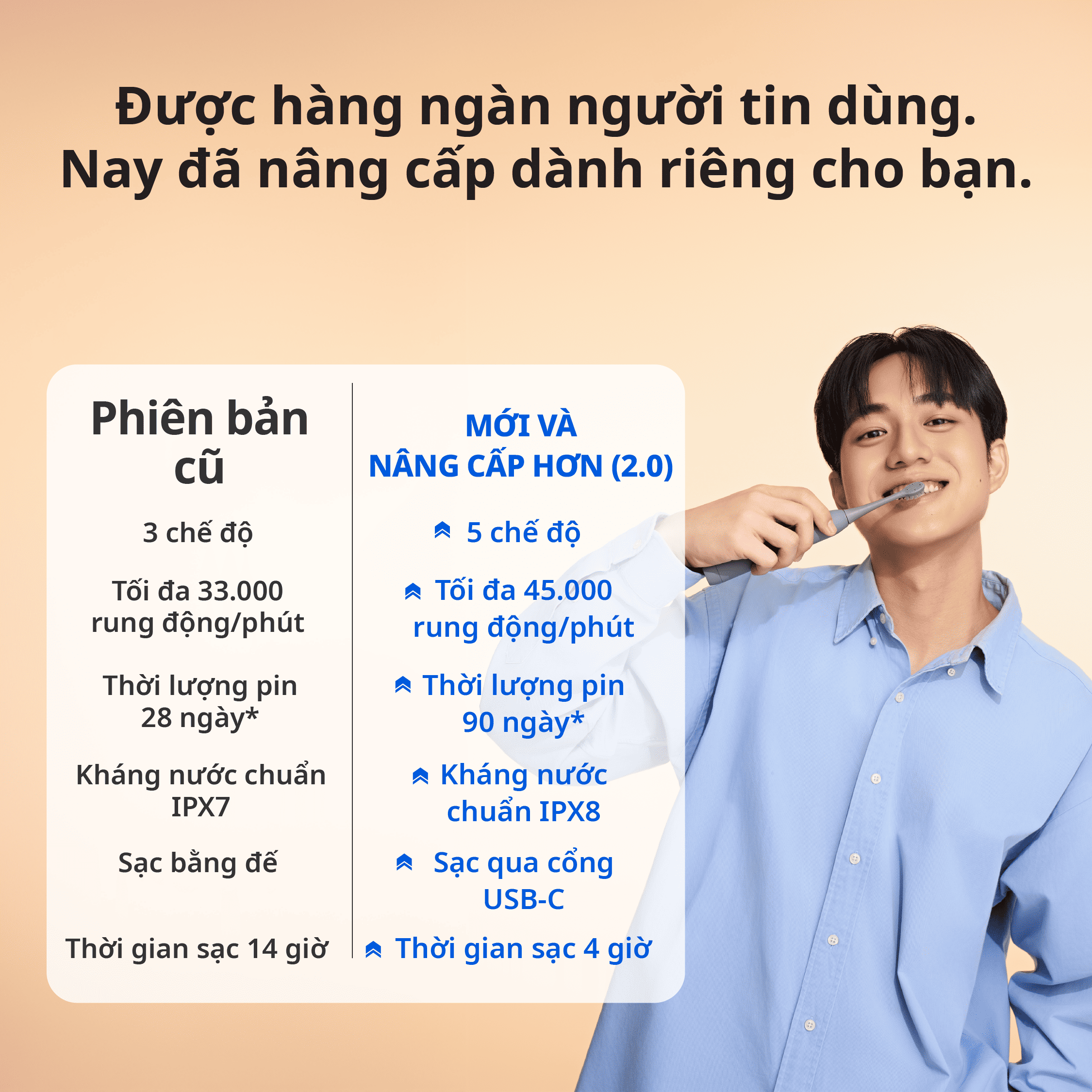 - Công nghệ sóng âm Sonic (Sonicare): Tạo ra tới 62.000 chuyển động bàn chải mỗi phút (31.000 rung động/phút), tạo ra các bong bóng siêu nhỏ chứa kem đánh răng và nước, len lỏi