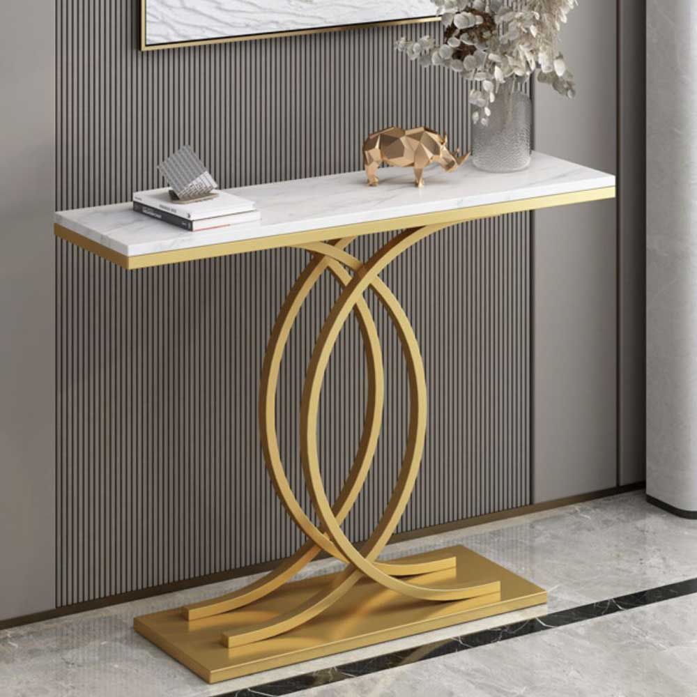 Bàn console, bàn trang trí mặt đá trắng khung sơn vàng CSTCT019 với điểm nhấn khung sắt sơn màu vàng kết hợp mặt đá trắng vân tạo toát lên vẻ đẹp sang trọng giúp nâng tầm giá