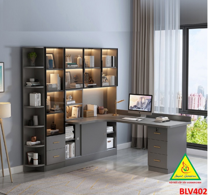 Bàn liền kệ kết hợp tủ trưng bày: Tận dụng không gian hiệu quả, tích hợp kệ sách, kệ tài liệu và tủ cánh kính trưng bày đồ decor, huy chương, mô hình, nước hoa...