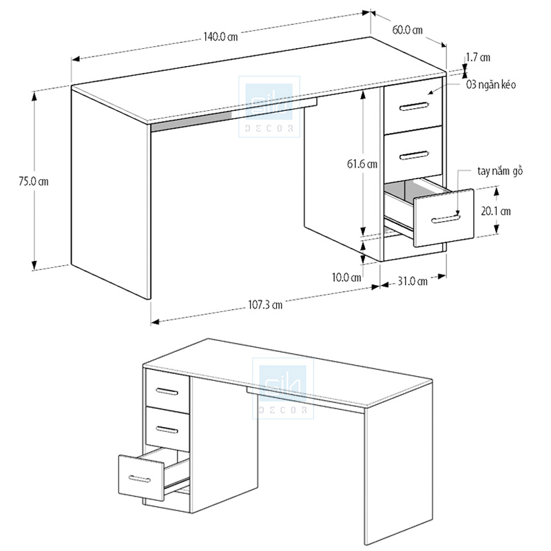 - Bàn làm việc có thiết kế đơn giản. Phần chân bàn được chia thành 3 ngăn kéo hoặc 6 ngăn với tay nắm gỗ giúp bạn dễ dàng đóng mở dễ dàng và lưu trữ được nhiều vật dụng.