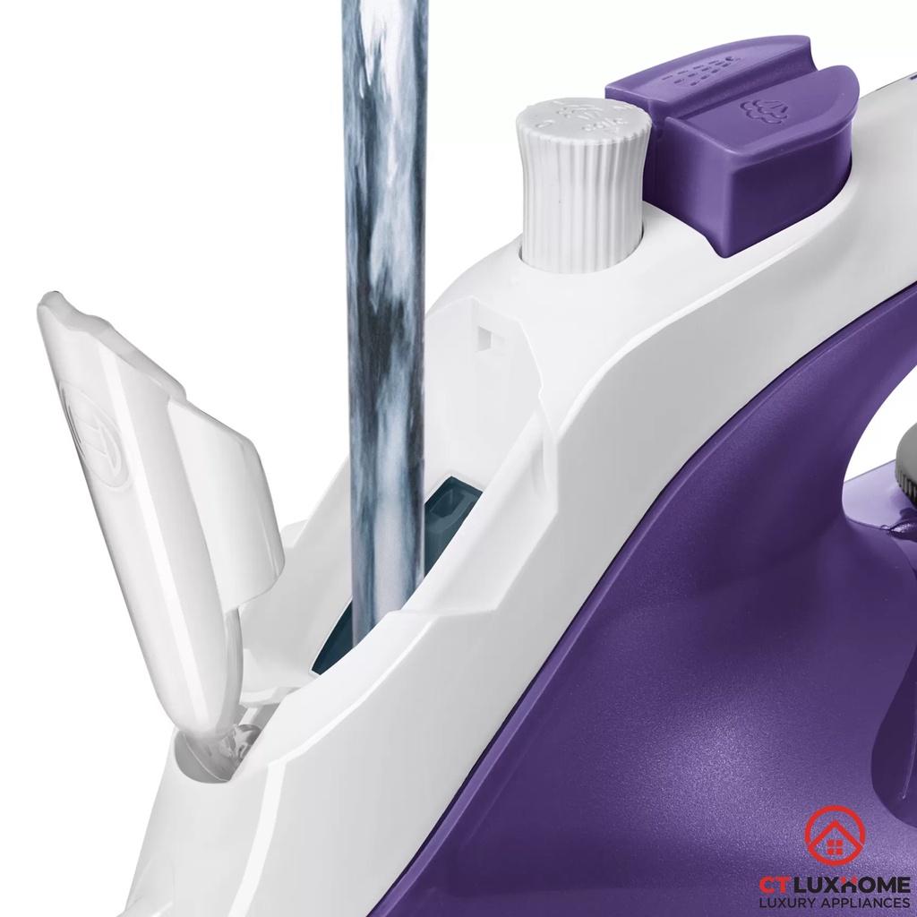 Màu sắc thời trang có màu tím thanh lịch, mặt đế bàn ủi phủ Titanium chống dính dày bền. Bàn ủi lướt êm ái trên mọi chất liệu vải, dễ làm sạch. Rãnh cúc và