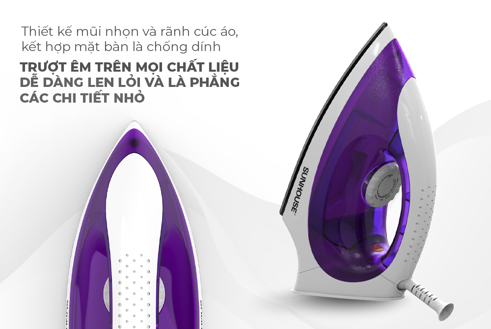 - Thiết kế gọn nhẹ, dễ sử dụng Bàn là khô SUNHOUSE SHD2011 màu trắng kết hợp với màu tím, bắt mắt làm sinh động không gian sử dụng. Tay cầm thiết kế vừa vặn giúp người dùng ủi chắc chắn, không gây mỏi khi phải ủi nhiều và ủi lâu. Khớp nối giữa dây điện và bàn ủi có thể xoay 360° tạo sự thuận tiện cho người sử dụng và hạn chế sự xoắn dây gây phiền phức khi sử dụng. Ngoài ra, mũi bàn là nhọn giúp len lỏi tốt vào các vùng ủi hẹp như cổ áo, hai hàng cúc, nách áo…
