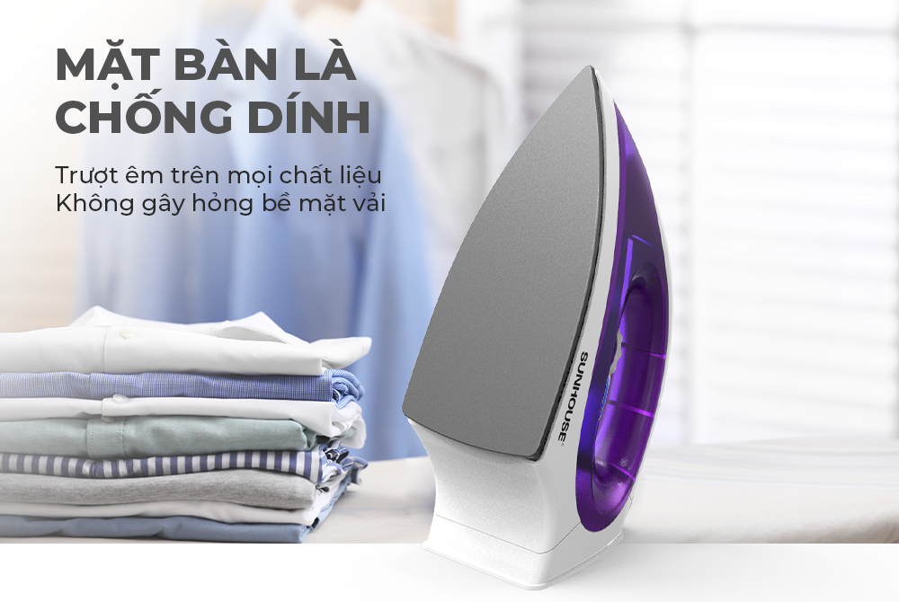 - Mặt bàn là chống dính, phù hợp mọi chất liệu Bề mặt bàn là được phủ lớp chống dính siêu bền, giúp bàn là trượt êm trên mọi chất liệu, tránh làm cháy xém quần áo, hạn chế bóng vải và dễ dàng vệ sinh khi cần thiết.