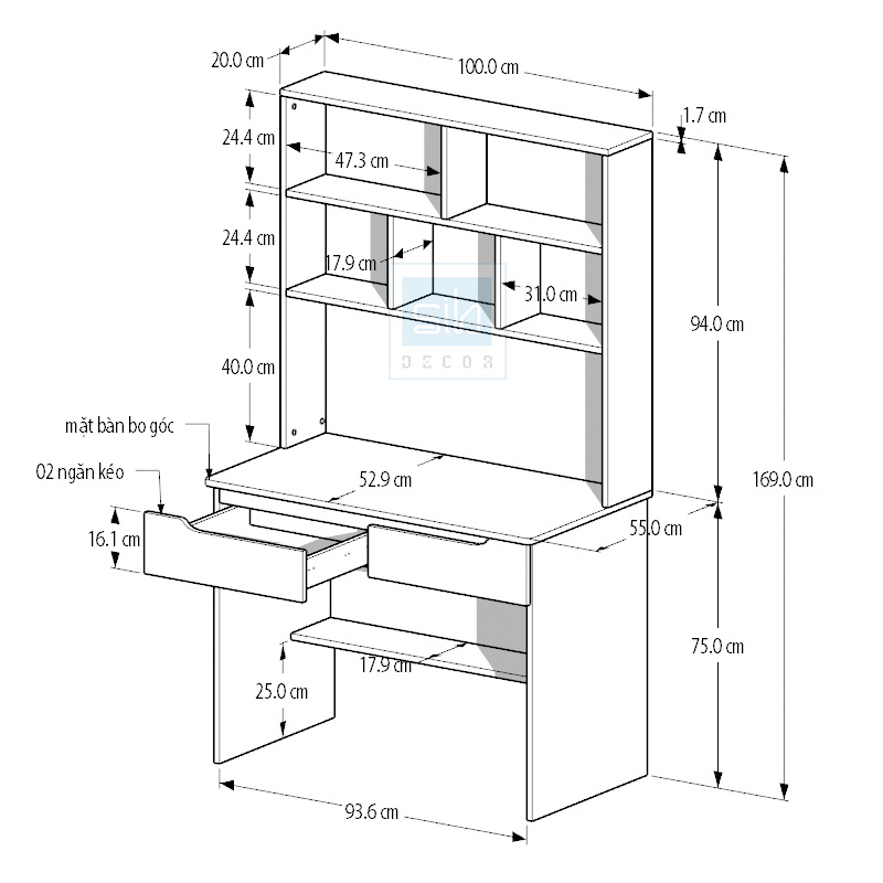 - Mặt bàn 100x55cm cho bạn một không gian làm việc thoải mái. Phù hợp với không gian có diện tích vừa phải và nhu cầu sử dụng cho 1 người.