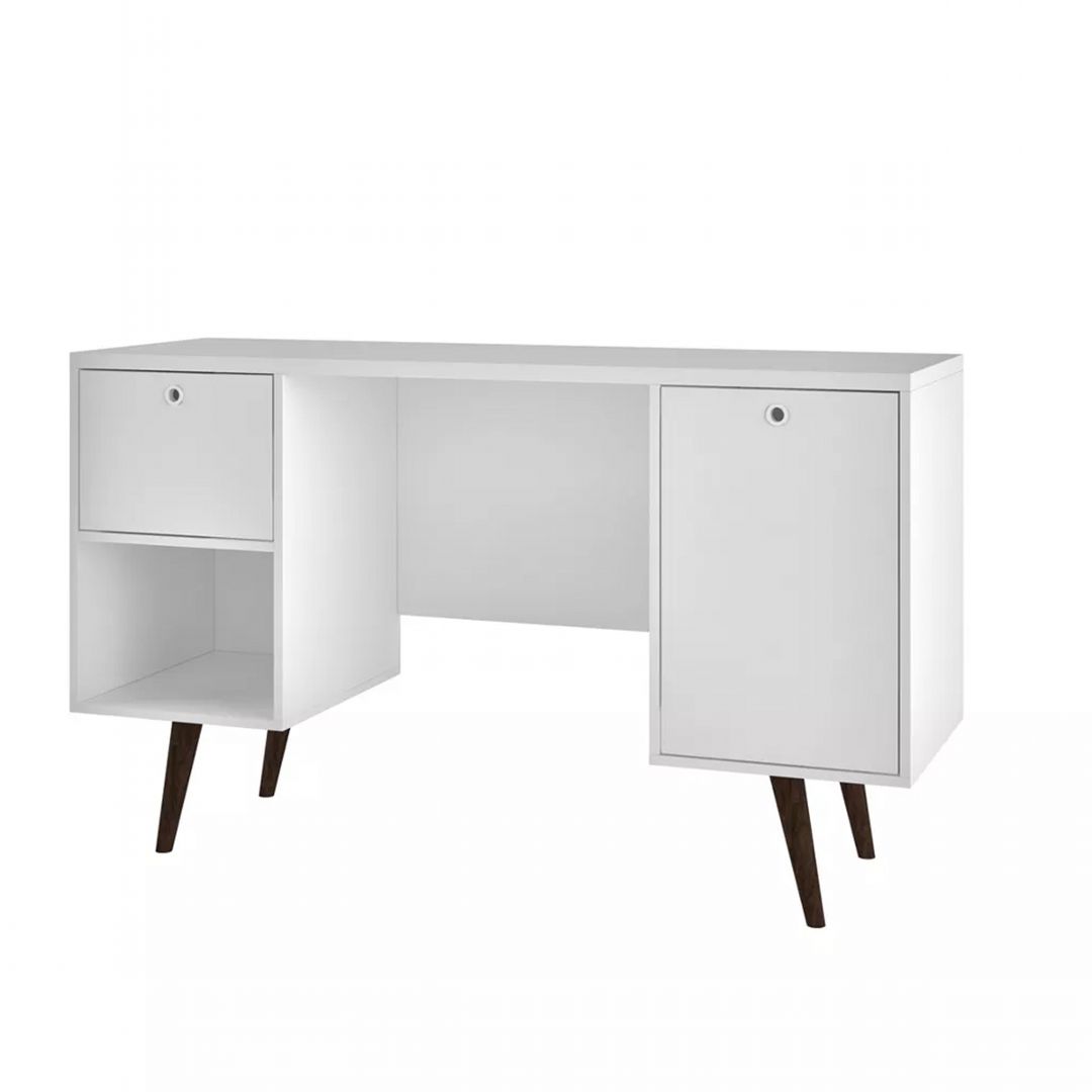 - Tên sản phẩm: Bàn làm việc IGA kèm kệ sách decor phong cách minimalism - Màu sắc: Trắng - Chất liệu: Chân thép phủ sơn tĩnh điện, mặt gỗ mdf phủ melamin chống xước