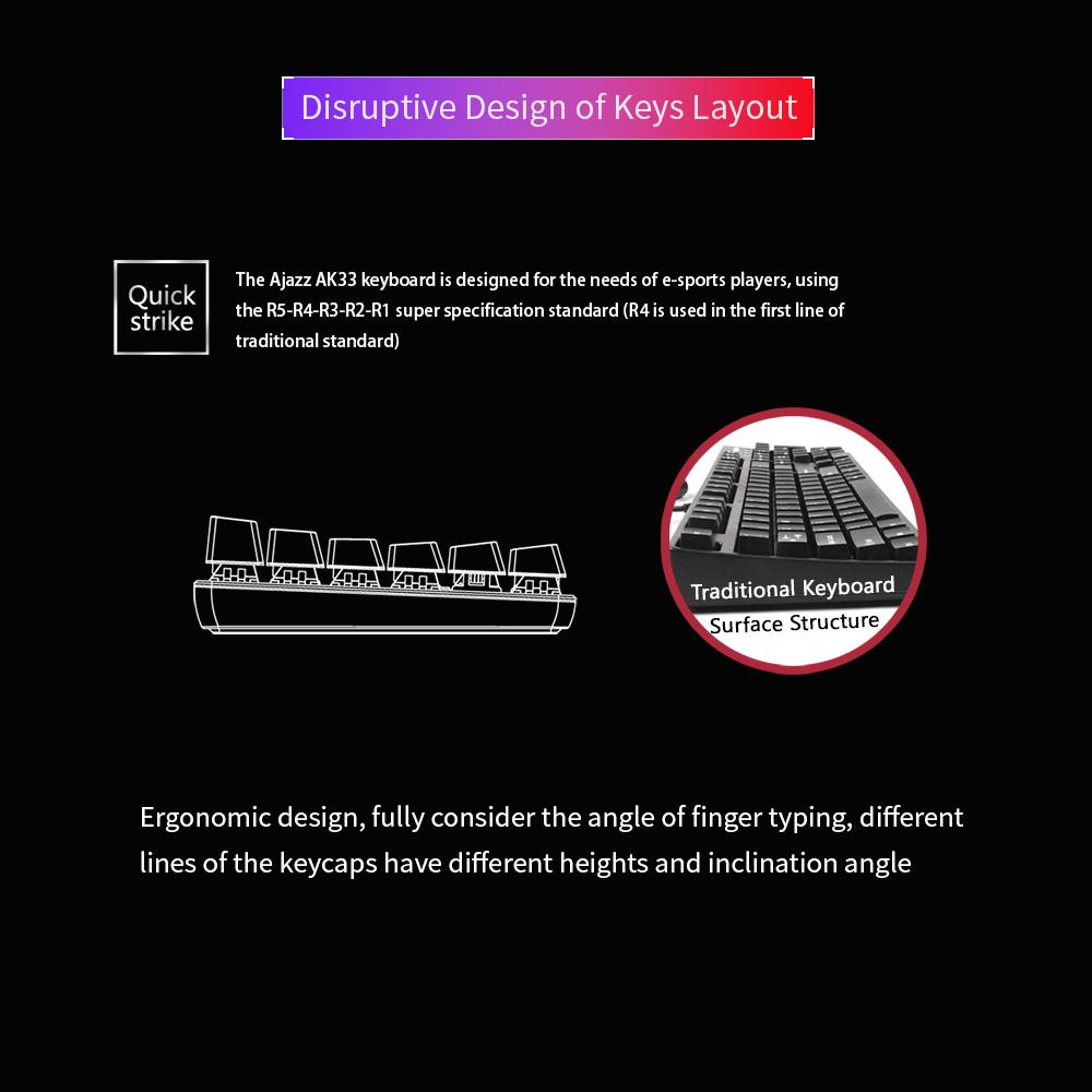 Description:A-JAZZ black switches mechanical gaming keyboard with fast response, good tactile feedback and excellent keystroke feeling, brings you perfect using experience when you type or play games...