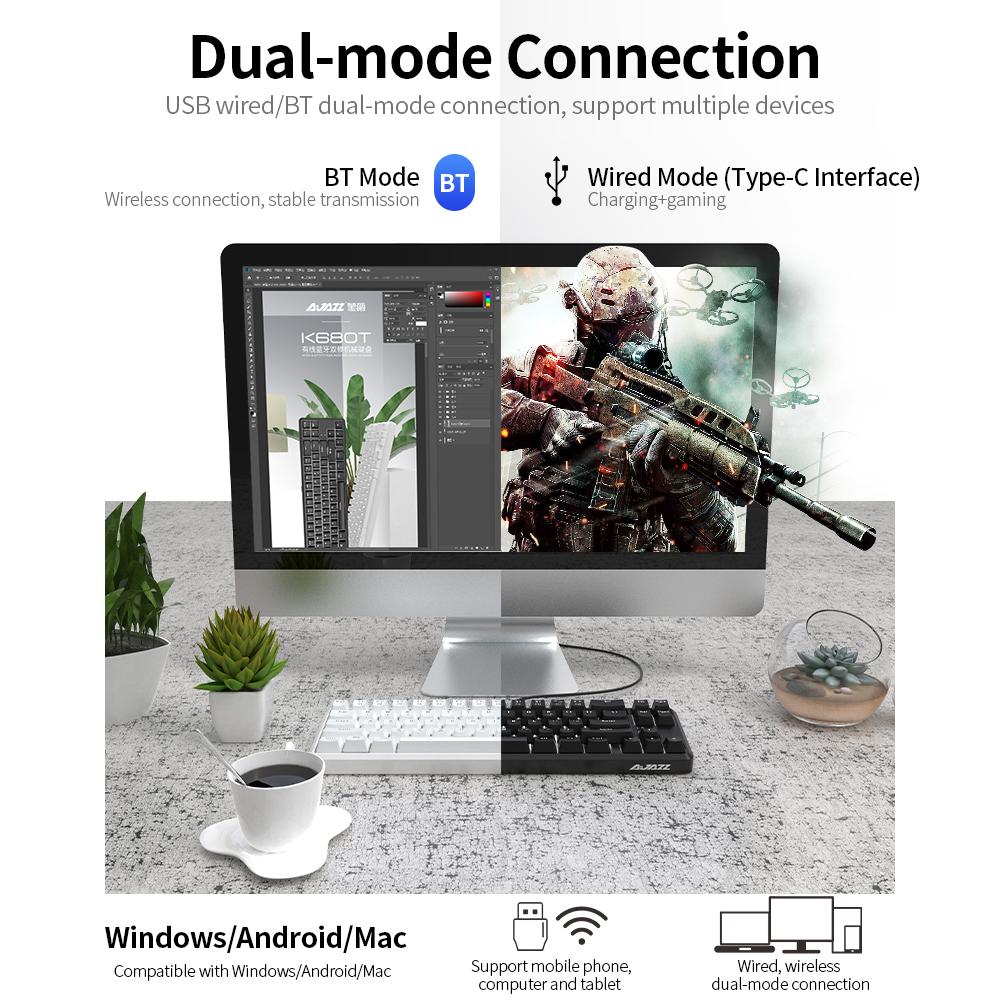 Features: USB wired/BT dual-mode connection, support multiple devices. It can connect wih three devices, easy to switch. 68 keys compact layout, gives the mouse more activity space, independent direction keys make the game control more