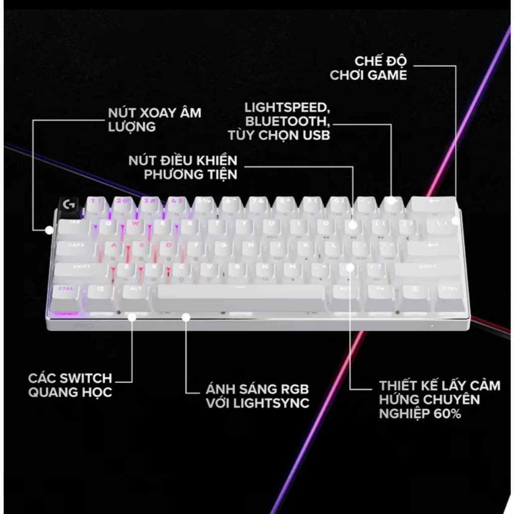 - Đặc điểm nổi bật Bàn phím chơi game cơ học TKL 60% Bàn phím không dây Logitech PRO X 60 Lightspeed là thế hệ tiếp theo của bàn phím không dây chuyên nghiệp, được thiết kế dành cho các vận động viên thể thao điện tử để mang lại hiệu suất cao nhất và đảm bảo chiến thắng Logitech PRO X 60 Lightspeed là bàn phím không dây nhỏ gọn, thiết kế đẹp mắt với 3 màu sắc dễ lựa chọn: Đen, đỏ, trắng I apshop.vn Tối đa hóa không gian của bạn mà không ảnh hưởng đến hiệu suất; Bàn phím cơ TKL nhỏ gọn mang lại nhiều không gian di chuyển chuột hơn để bạn có thể tập trung vào chiến thắng. Kết nối không dây LIGHTSPEED Điều khiển chế độ trò chơi, bố cục bàn phím tiêu chuẩn với khả năng tương thích 3P, điều khiển phương tiện và con lăn âm lượng cũng như các phím có đèn nền LIGHTSYNC RGB có thể tùy chỉnh thông qua G HUB. Logitech PRO X 60 Lightspeed kết nối không dây qua bộ chuyển đổi LIGHTSPEED với tốc độ phản hồi siêu nhanh I apshop.vn Kết nối không dây qua bộ chuyển đổi LIGHTSPEED với tốc độ phản hồi siêu nhanh 1 ms hoặc qua Bluetooth; kết nối USB tùy chọn. Switch GX Công tắc quang GX mang lại khả năng truyền động nhanh hơn và độ trễ nảy bằng 0; chọn từ các công tắc xúc giác hoặc tuyến tính tùy theo phong cách chơi của bạn Bàn phím thoải mái chơi theo cách của bạn với các tùy chọn phím switch quang học GX: tactile và linear I apshop.vn Hiệu suất được cải thiện Bộ chuyển đổi chế độ chơi game, nút cuộn âm lượng và các nút điều khiển phương tiện được đặt một cách cẩn thận giúp bạn tập trung vào điều quan trọng: chiến thắng. Tối đa hóa không gian của bạn mà không ảnh hưởng tới hiệu suất với thiết kế chuyên nghiệp 60% I apshop.vn Logitech PRO X 60 Lightspeed là một bàn phím không dây tuyệt vời cho game thủ và người dùng văn phòng. Thiết kế nhỏ gọn, kết nối không dây ổn định, switch GX chất lượng cao và thời lượng pin lâu dài là những ưu điểm nổi bật của bàn phím này.