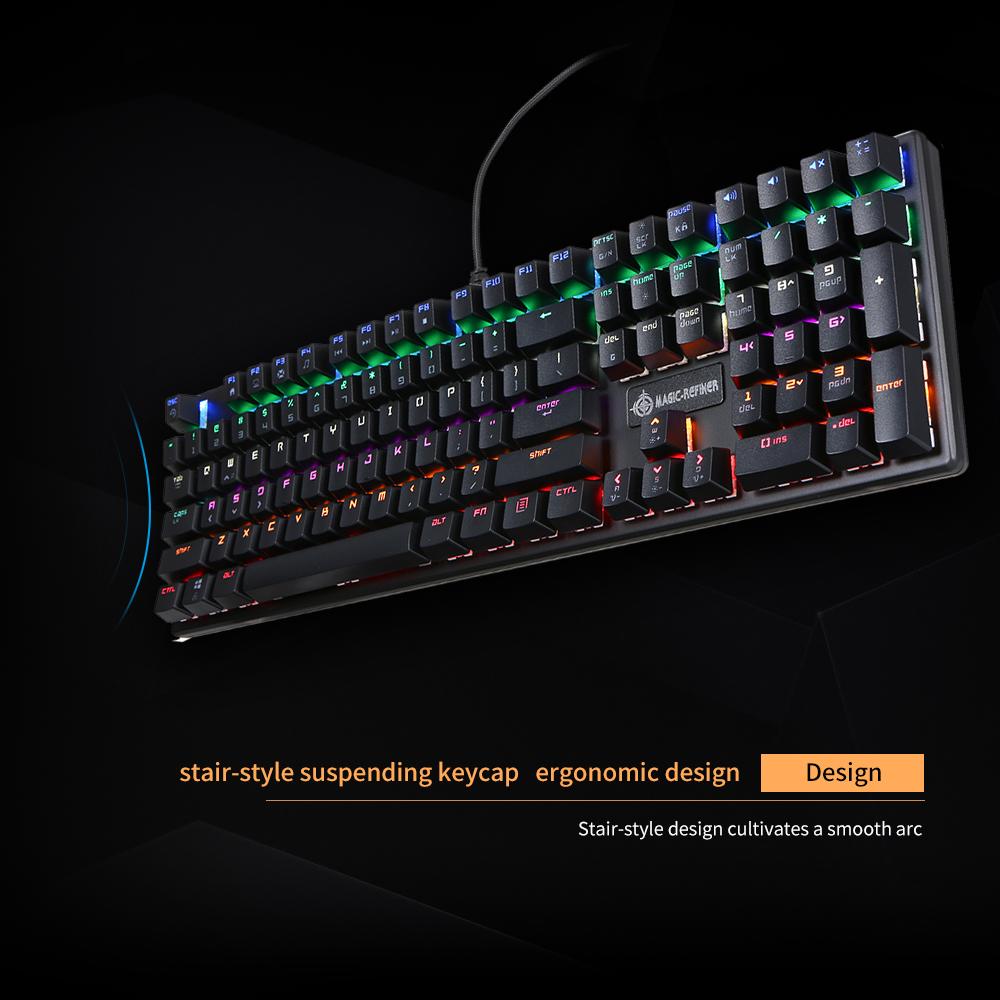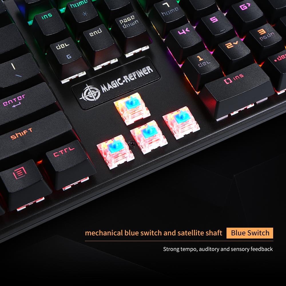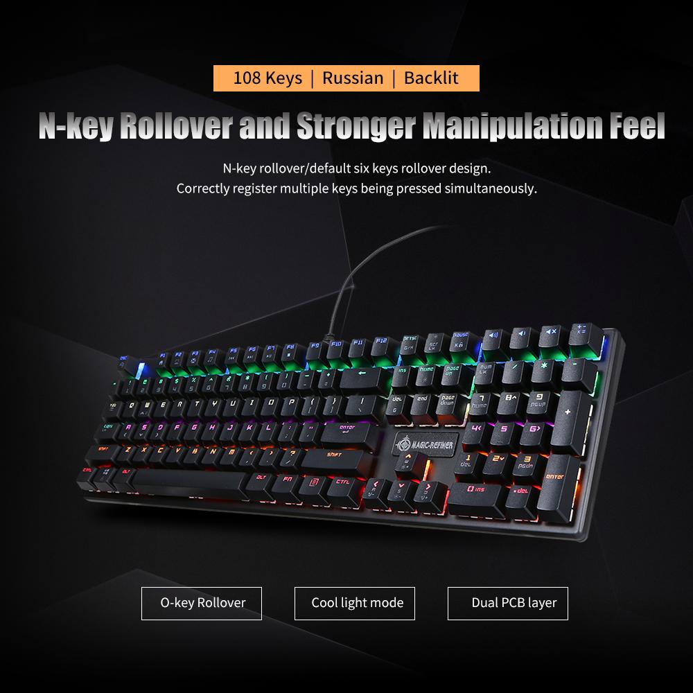 MAGIC-REFINER Mechanical Keyboard is designed for game player. 108 N-keyrollover key and 10 styles cool backlit gives you ultimate game experience.Mechanical blue switch brings quick response and let you enjoy smooth gameplaying. Support both English and Russian languages.