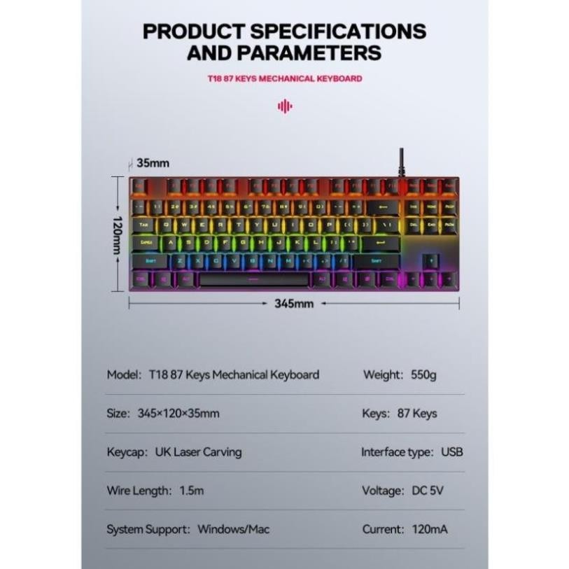 Mô tả sản phẩm Bàn Phím cơ T-Wolf T18, Blue Switch, USB, LED, 87 Gaming