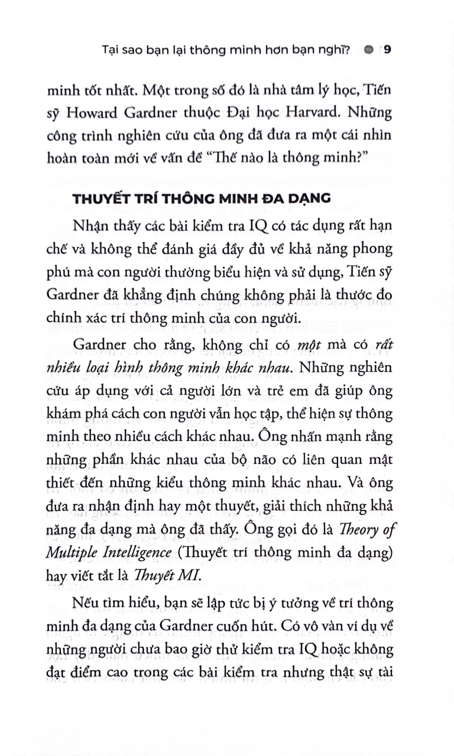 Những điều này có thể khiến bạn ngạc nhiên bởi trí thông minh có thể biểu hiện theo nhiều cách thức khác nhau – trong nghệ thuật, âm nhạc, thể thao, trong cách cảm nhận, sự hiểu biết về thiên nhiên và sống hòa hợp với những người xung Bạn thông minh hơn bạn nghĩ sẽ giúp bạn khám phá ra rằng có vô vàn cách biểu hiện trí thông minh.