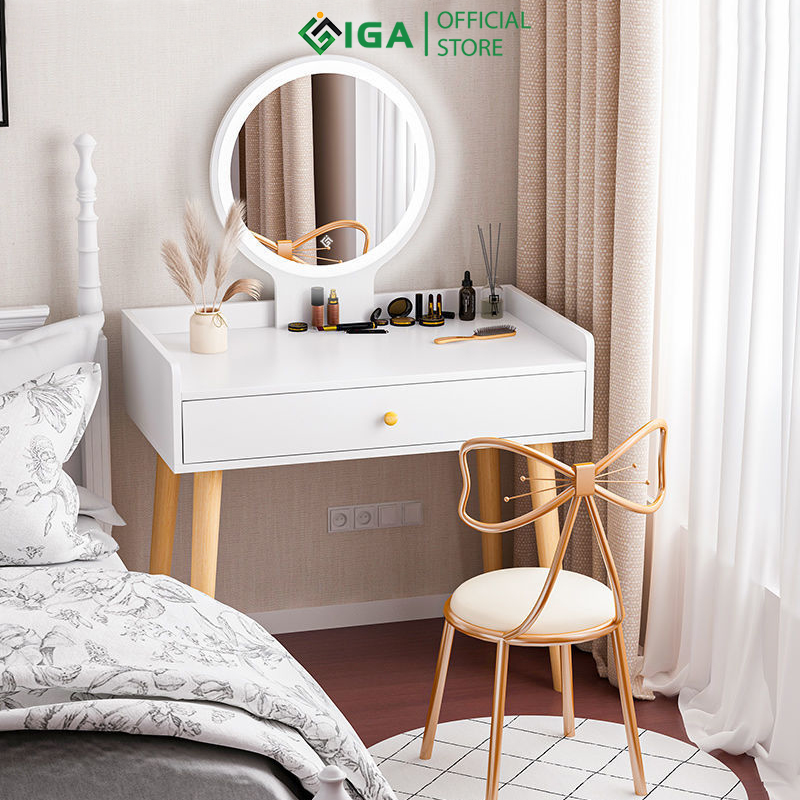 - Tên sản phẩm: Bàn trang điểm thông minh thương hiệu IGA (KHÔNG BAO GỒM GHẾ, GƯƠNG) - Kích thước: Chiều dài điều chỉnh từ 100-130cm, rộng 40cm, cao 74cm - Chất liệu: Gỗ MDF