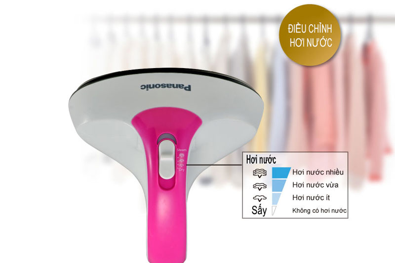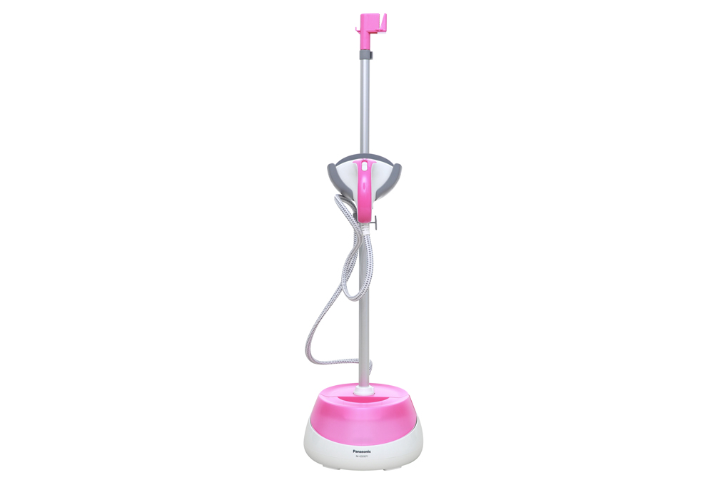 Bàn ủi hơi nước đứng Panasonic màu hồng dễ thương, nổi bật, thiết kế kiểu bàn ủi hơi nước đứng cao gọn, ủi đồ dễ dàng ngay trên móc treo, không cần dùng cầu ủi