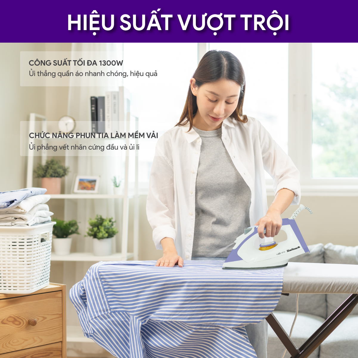 Đặc điểm nổi bật Thiết kế hiện đại, di chuyển dễ dàng, kích thước gọn Công suất 1200W làm nóng nhanh, tiết kiệm thời gian ủi Mặt đế chống dính lướt êm ái trên mặt