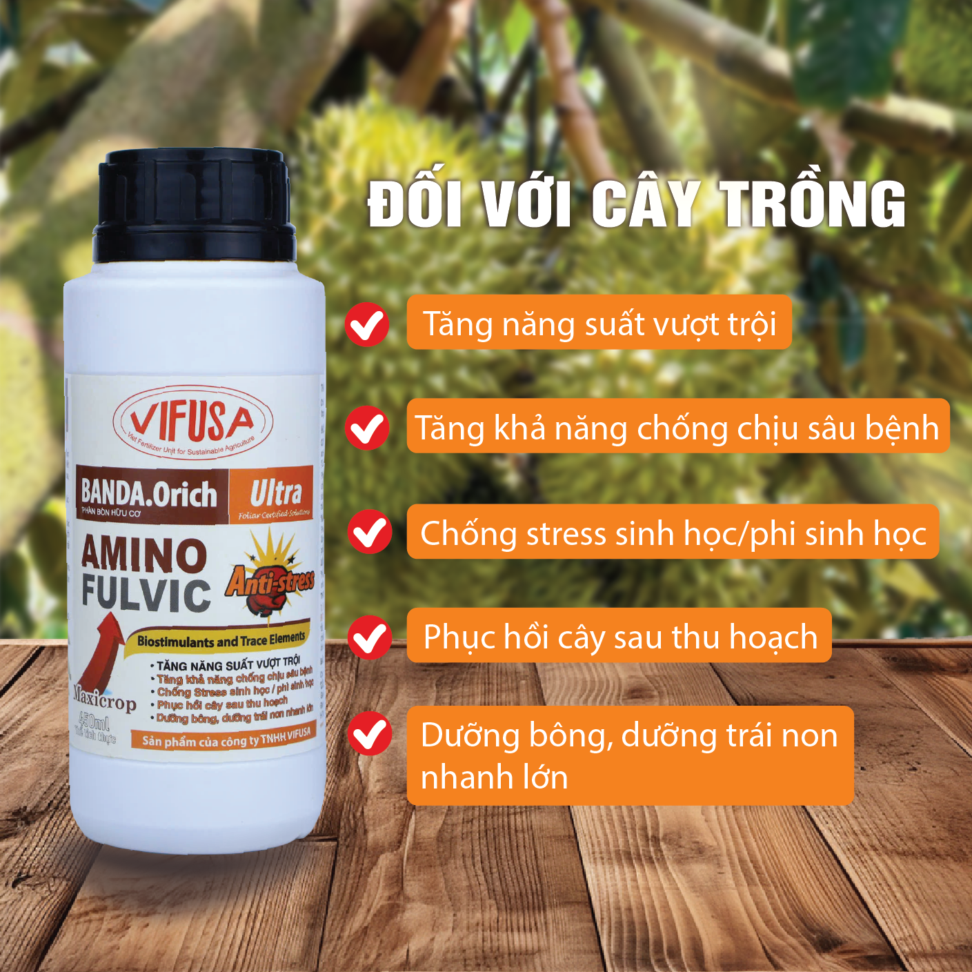 BANDA.Orich Ultra là Plant Activator chứa 3 thành phần hữu cơ cân đối (Acid Amin, Acid Fulvic và Vi lượng thiết yếu) giúp kích thích cây trồng phát triển chồi mới, ra hoa, hình thành trái và tăng năng suất cây trồng.