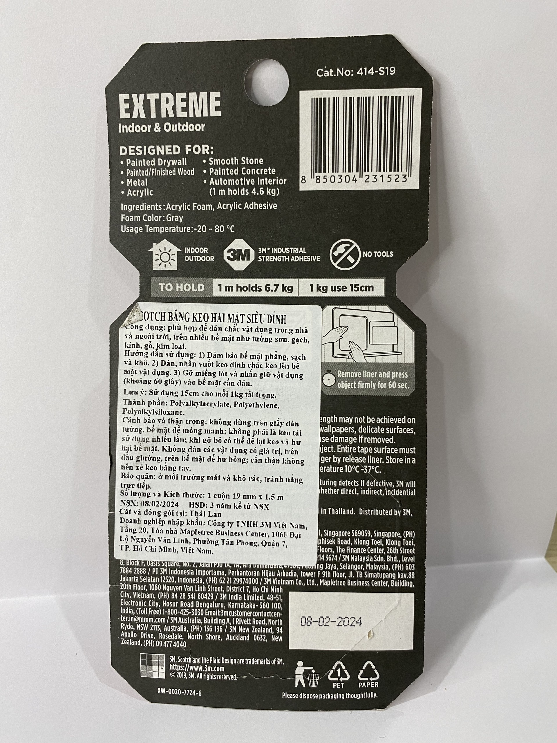 Băng keo hai mặt dùng trong nhà và ngoài trời Scotch 3M siêu dính 414 - Độ bền cao, dính tốt trên bề mặt được sơn, kéo nhẹ nhàng, cắt dễ dàng, được tráng lớp nhựa Acrylic dẻo, chịu nhiệt, có khả năng chống chịu với thời tiết, được thiết kế sử dụng cho cả bên trong nhà và ngoài trời. Được cấu tạo với 3 lớp màng dính siêu bền, chống bụi bẩn, thách thức với thời tiết khắc nghiệt, kết dính lâu dài trên nhiều loại bề mặt khác nhau, bao gồm cả máy móc động cơ của ô tô. Thông số kỹ thuật: Thương hiệu: 3M Xuất xứ thương hiệu: Mỹ Sản xuất tại: Thái Lan Mã sản phẩm: 414-S19 Quy cách: 1 cuộn/vỉ Kích thước: 19mm x 1.5m, 19mm 4m Hạn sử dụng: 3 năm ĐẶC TÍNH SẢN PHẨM