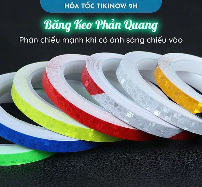 - Băng keo phản quang chống nước, có thể dùng ngoài trời, dán ngoại thất oto. Băng keo dạ quang chỉ nên sử dụng trong nhà. Kích thước: kích thước được ghi ở phần chọn sản phẩm. Ví dụ 1cm*8m nghĩa là băng keo có bề ngang rộng 1cm, dài tổng cộng 8m.