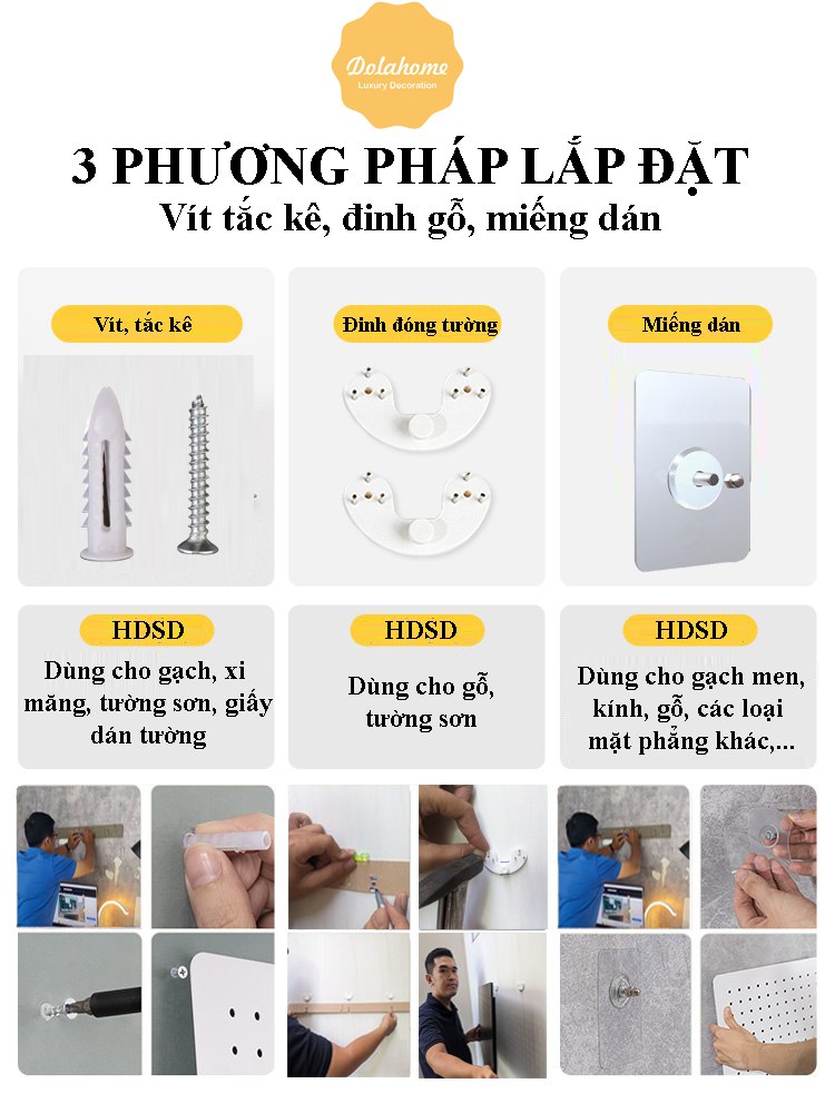- Cách treo vít + tắc kê sử dụng ở mọi bề mặt và tải trọng cao
