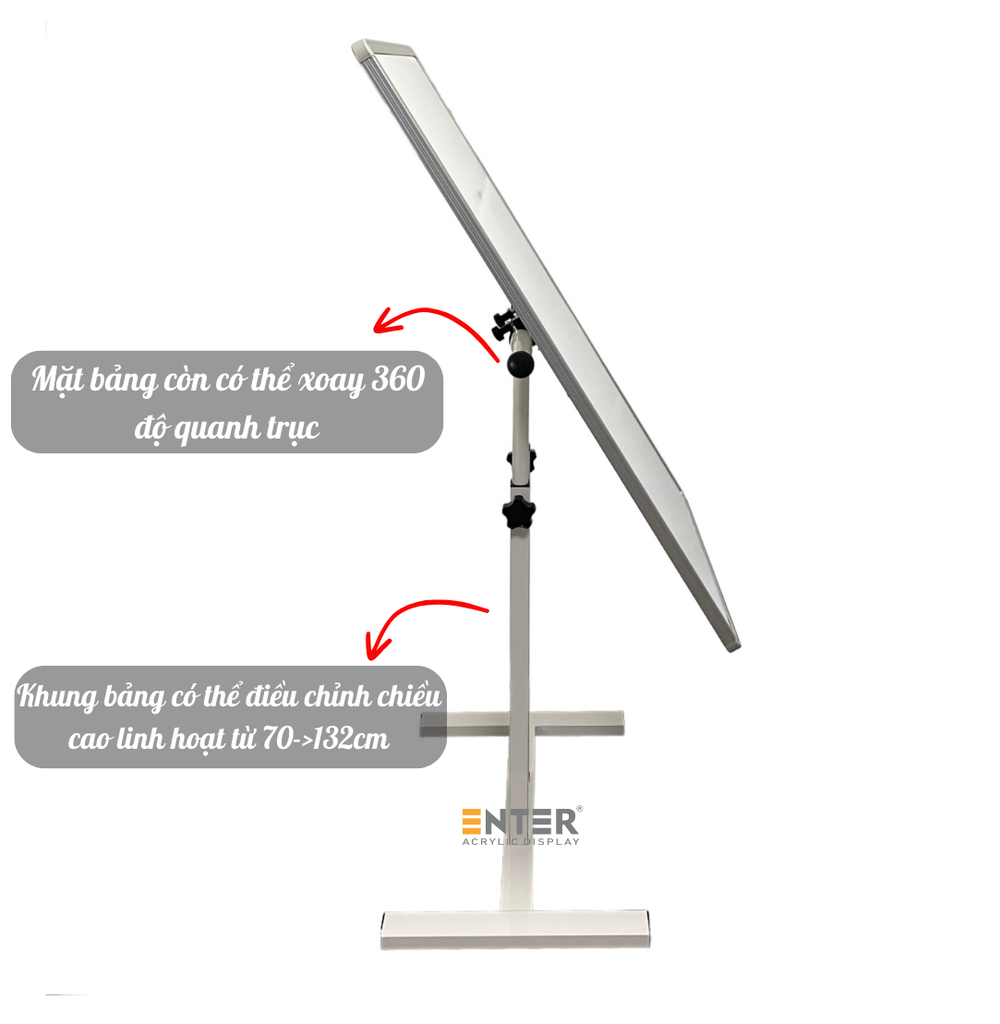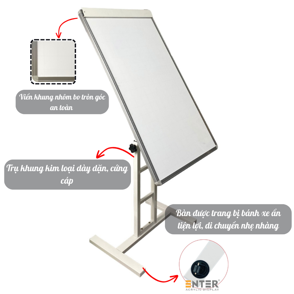 Sản phẩm được tặng kèm 3 Bút lông bảng TL WB-03 (xanh, đỏ, đen) và 1 Kệ bút lông bảng Enter H16B có nam châm (màu ngẫu nhiên).  Sản phẩm được giao chưa lắp đặt sẵn, chúng tôi có kèm theo giấy hướng dẫn lắp đặt và video hướng dẫn. Nếu có thắc mắc về lắp đặt và sử dụng sản phẩm, Quý khách vui lòng liên hệ cho chúng tôi để được hỗ trợ kịp thời. Mô tả sản phẩm Quy cách:                   100 x 60cm Đơn vị tính:                 Cái Đóng gói:                    1 Xuất xứ:                       Việt Nam Ngoài kích thước có sẵn Quý khách có thể đặt hàng kích thước theo yêu cầu. Chất liệu:                      Bảng di động Enter KT303 được làm từ kim loại giúp bàn đứng vững, cứng cáp. Ngoài ra, mặt khung bảng được thiết kế điều chình xoay 360 độ, chân bàn còn được trang bị bánh xe giúp việc sử dụng, di chuyển và điểu khiển hướng đi dễ dàng, có thể nhanh chống gấp gọn sau khi dùng, không chiếm nhiều diện tích không gian. Công dụng: Bảng di động Enter KT303 với thiết kế đơn giản cùng các tone màu trắng phối chi tiết đen, có thế điều chỉnh chiều cao tối thiểu từ 70cm và tối đa đến 132cm hoàn toàn thích hợp với nhiều mục đích và không gian sử dụng như dùng để trình bày trong hội thảo, giảng day, họp nhóm tại công ty, trường học,... Sản phẩm có thể in hoặc khắc logo theo yêu cầu. Công ty TNHH VPP Khắc Dấu Sao Mai chuyên sản xuất các sản phẩm bằng mica giá rẻ, chất lượng: , , , , , , , , , … Với máy móc, thiết bị hiện đại, Sao Mai có thể đáp ứng đa dạng các sản phẩm mica theo yêu cầu của Quý khách.