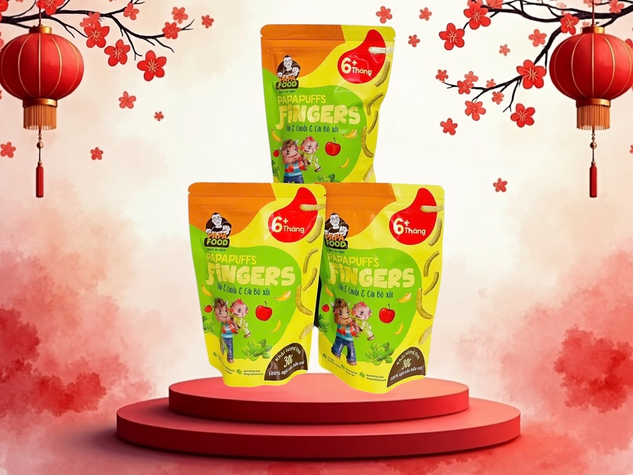 1. Tên sản phẩm: Bánh ăn dặm PAPAPUFFS FINGERS - BÍ ĐỎ VÀ KHOAI LANG TÍM . 2. Thành phần: Được sản xuất từ 100% Nguyên Liệu Hữu Cơ - Gồm gạo lứt hữu cơ,