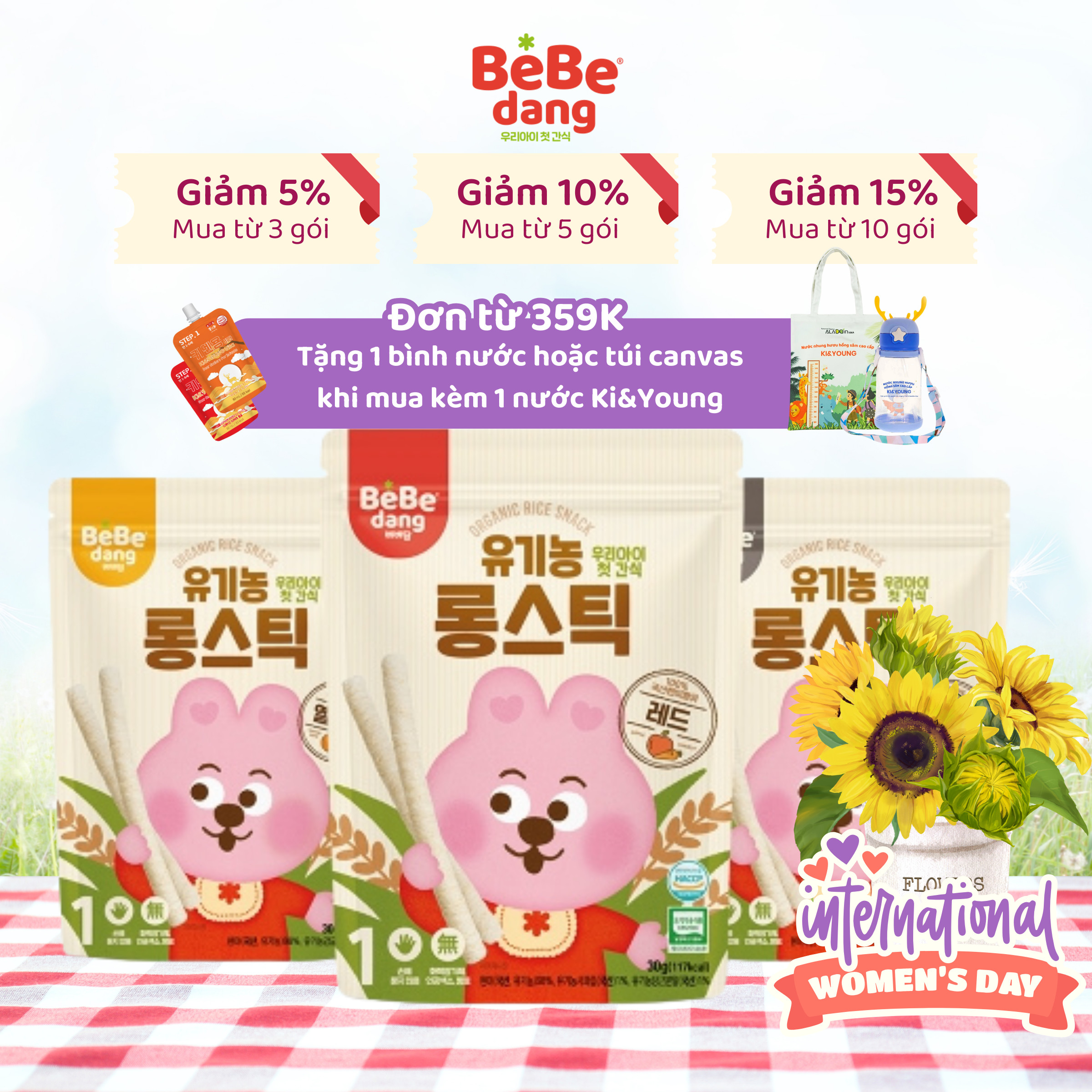 Khi mua các sản phẩm ăn dặm có giá trị đơn hàng từ 359.000 đồng trở lên và có kèm từ 01 sản phẩm nước Nhung Hươu Ki&Young sẽ được tặng ngẫu nhiên 01 Bình nước hoặc 01 Túi canvas