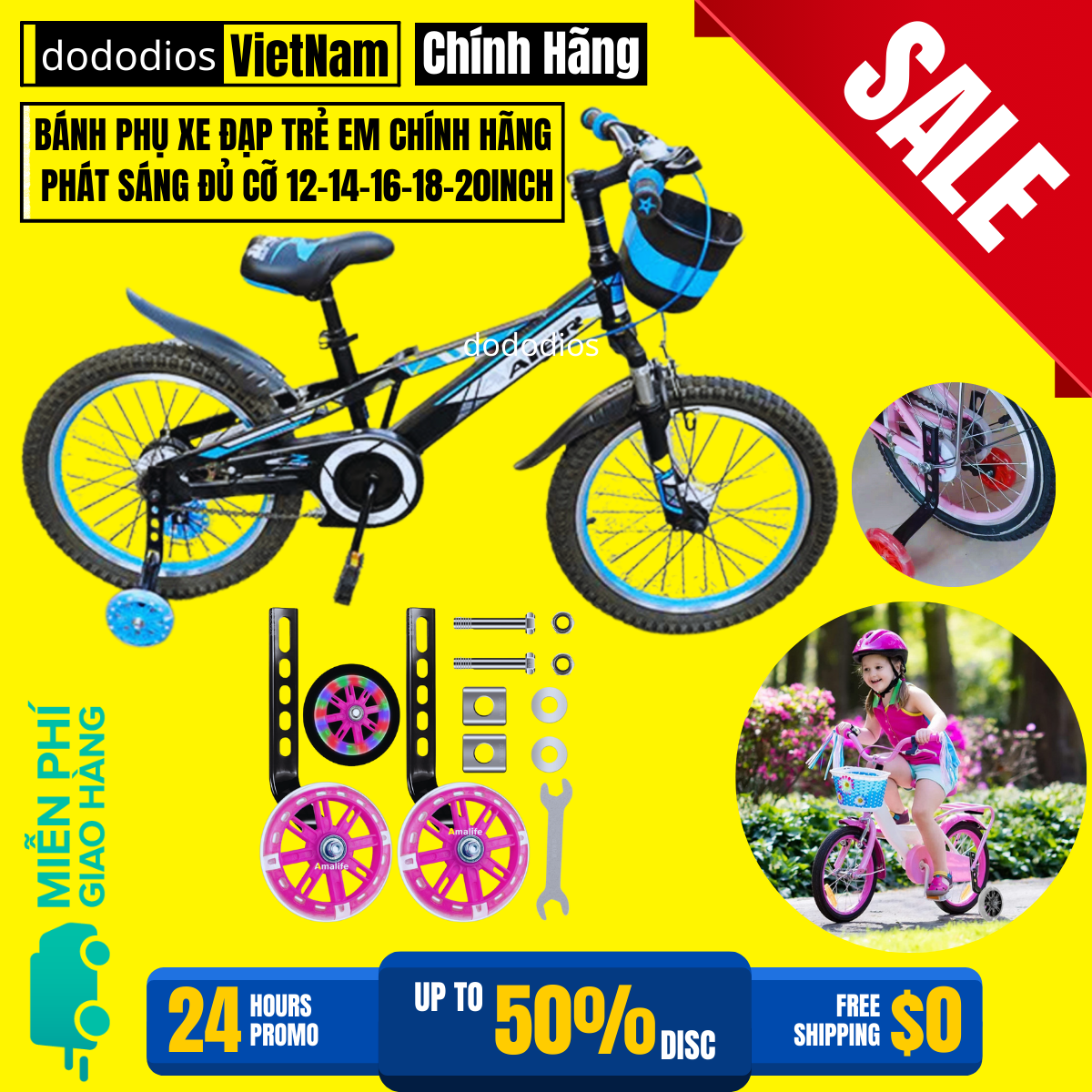 ✨Bánh Phụ Xe Đạp Trẻ Em Phát Sáng Cân Bằng Chắc Chắn Dành Cho Các Bánh Xe Size 12 14 16 18 20inch Chính Hãng dododios