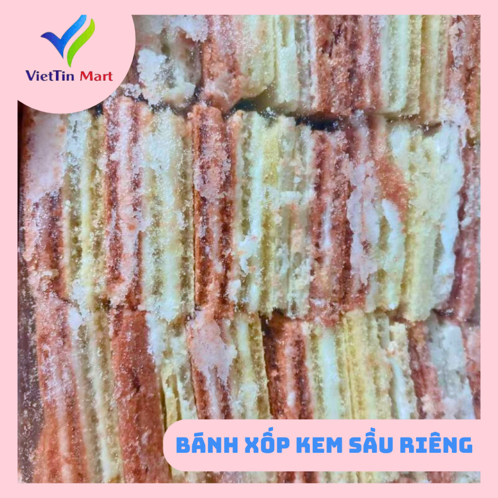 THÔNG TIN SẢN PHẨM Tên sản phẩm: Bánh Xốp Kem Sầu Riêng 400g Thành Phần: bột mì, bột năng, đường cát, bơ, sữa bột, hương sầu riêng, dầu thực vật, muố Thương hiệu: VIETTIN MART
