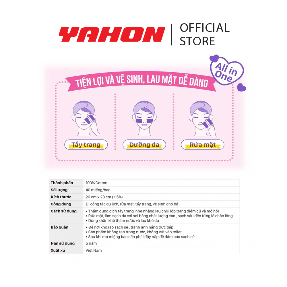 Mua tại TiktokKhăn lau mặt Pop-Puf tiện dụng mọi lúc mọi nơi giúp làm sạch hiệu quả bề mặt da. Vải 100% cotton thấm hút tốt đem lại sự thoải mái mềm mại cho da, giúp lau khô nước hoặc mồ hôi, bụi bẩn, chất nhờn dư thừa trên da dễ dàng. Có thể dùng với dung dịch tẩy trang để làm sạch lớp makeup trên da một cách hiệu quả. Thành phần: Vải không dệt 100% Cotton Quy cách: Định lượng vải: 50gr/m2 (±5%) 20*23cm/tờ, 40 miếng/bao, 60 bao/thùng Hướng dẫn dử dụng: Sử dụng lau mặt: Sau khi rửa sạch mặt, dùng khăn nhẹ nhàng đưa lên mặt thấm nước dư thừa trên da Sử dụng tẩy trang: thấm dung dịch tẩy trang vào khăn rồi nhẹ nhàng tẩy sạch lớp makeup, mồ hôi, bụi bẩn trên da Hạn sử dụng: 3 năm kể từ ngày sản xuất NSX: in trên bao bì