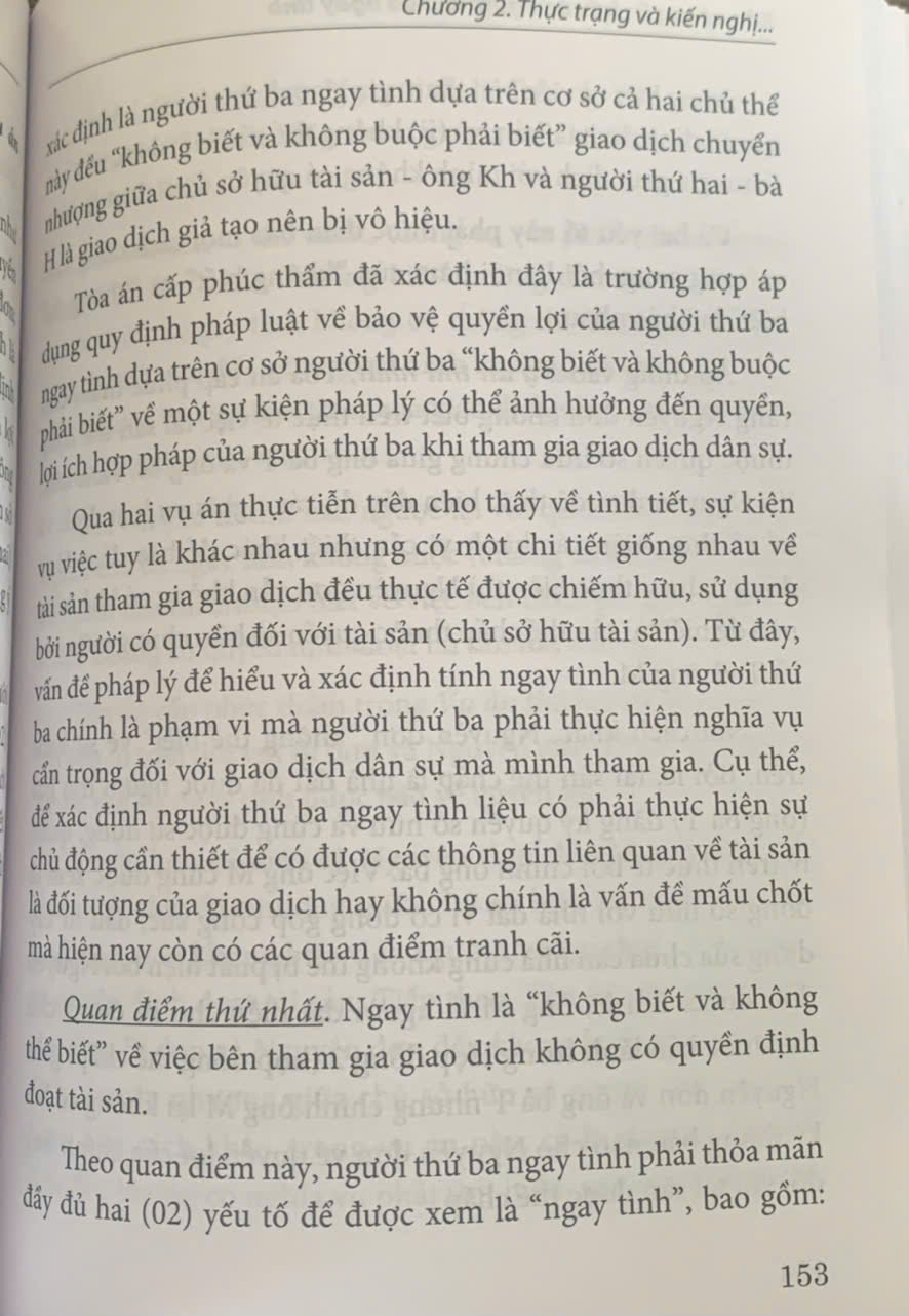 Do đó, việc thể một số trường hợp còn chưa thống nhất. Do đó, việc tiếp tục nghiên cứu lý luận và thực tiễn của các khía cạnh pháp lý về bảo vệ quyền lợi của người thứ ba ngay tình là hết sức cần thiết, không chỉ cho người nghiên cứu, người học luật mà cả những người làm thực tiễn, như Thẩm phán, Luật sư, Công tố viên, Điều tra viên... và những người tham gia xây dựng chính sách, pháp luật.