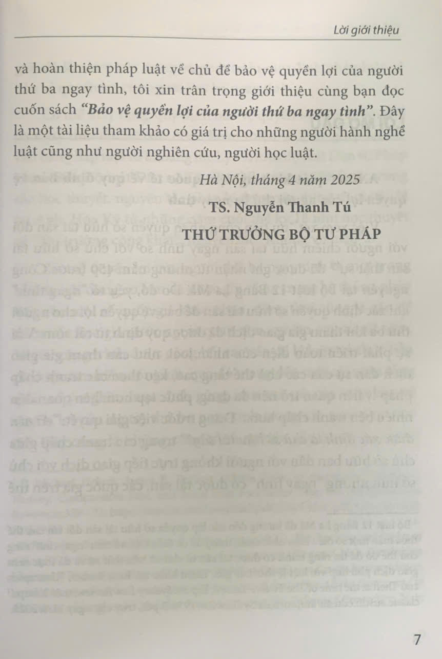 Với mong muốn tăng cường chất lượng, hiệu quả trong áp dụng, thi hành pháp luật; đẩy mạnh việc nghiên cứu, trao đổi và hoàn thiện pháp luật về chủ đề bảo vệ quyền lợi của người thứ ba ngay tình, tôi xin trân trọng giới thiệu cùng bạn đọc cuốn sách “Bảo vệ quyền lợi của người thứ ba ngay tình”. Đây là một tài liệu tham khảo có giá trị cho những người hành nghề luật cũng như người nghiên cứu, người học luật.