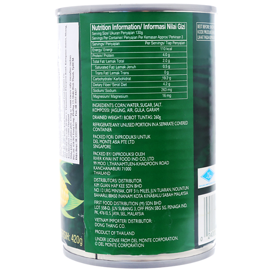 BẮP ĐÓNG HỘP DEL MONTE 420G  (THƯƠNG HIỆU MỸ- SX THÁI LAN)    Bắp Đóng Hộp Del Monte 420g có hương vị thơm ngon, hạt bắp dẻo ngọt, được sử dụng đa dạng trong chế biến các
