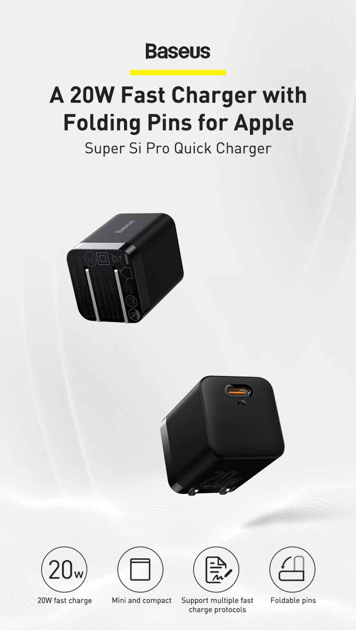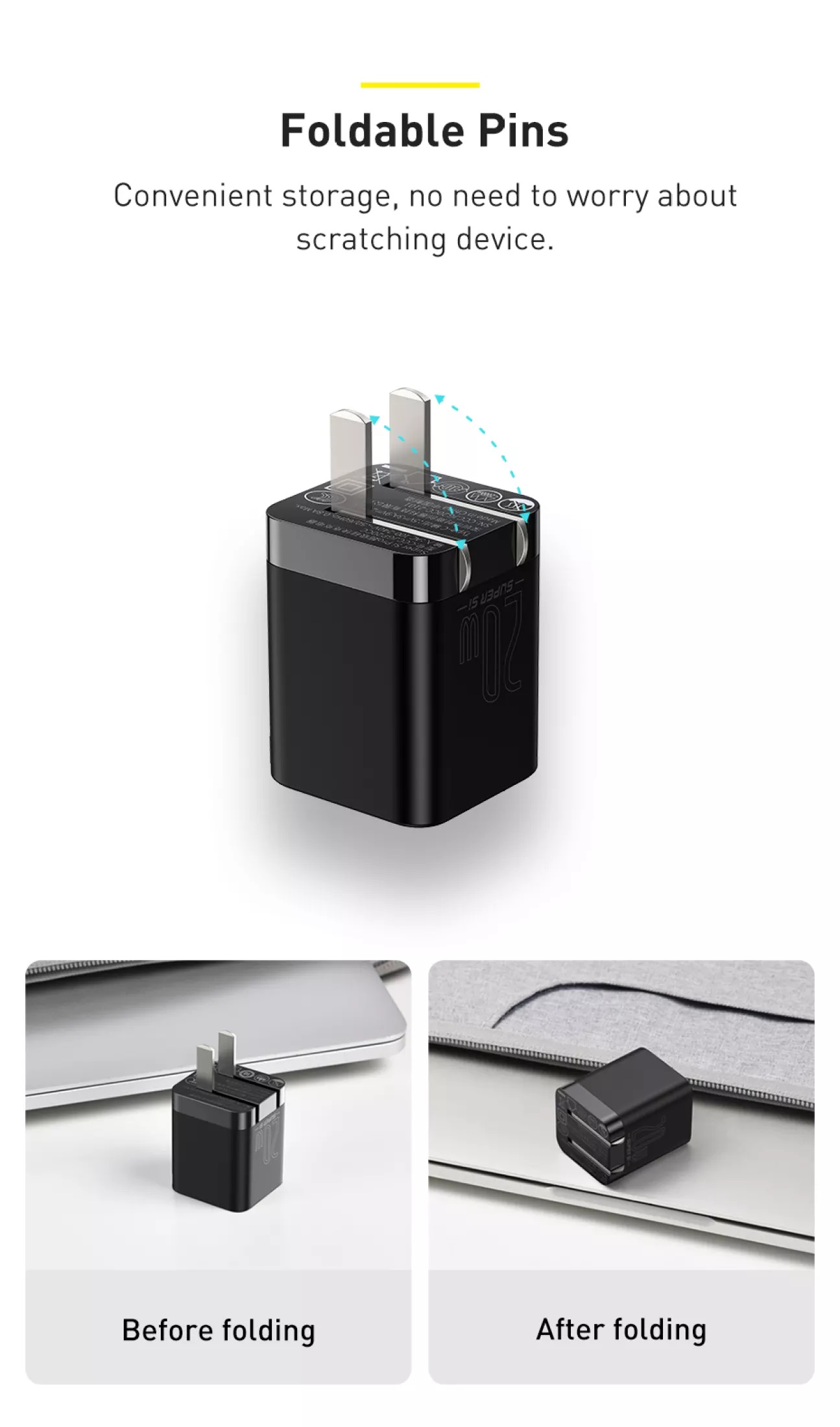 Baseus Super Si Pro Quick Charger 1 Type C 20W Cơ chế gập chân sạc nhanh gọn và chắc chắn. Chất liệu cứng cáp và bền bỉ. Sạc cực nhanh.