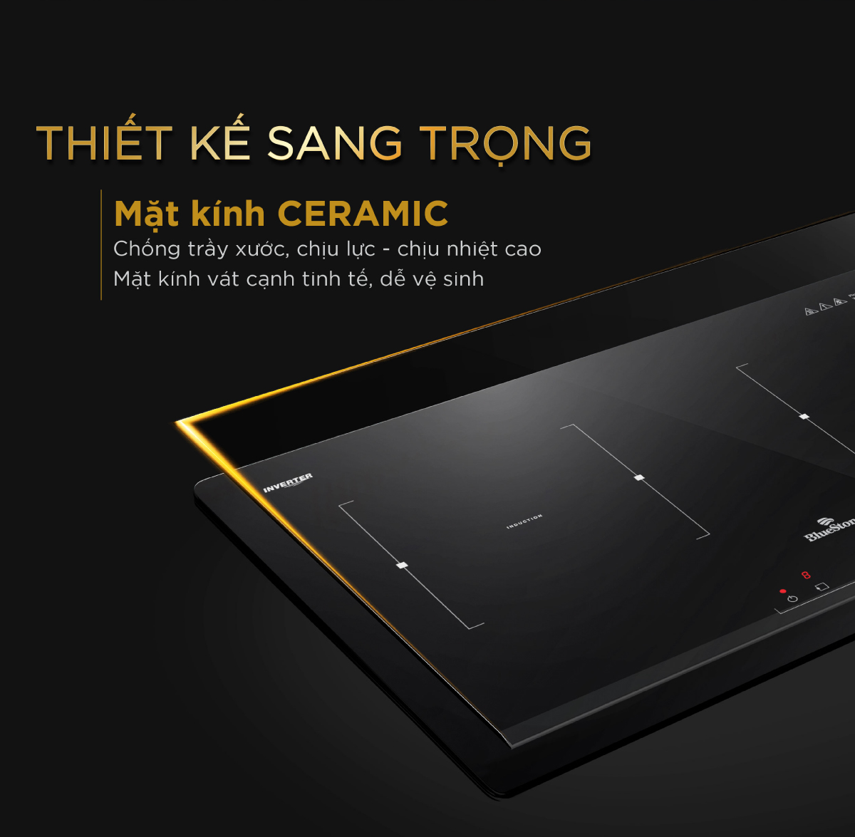 Mặt bếp bằng kính Ceramic cao cấp, chống mài mòn và chịu lực cao.