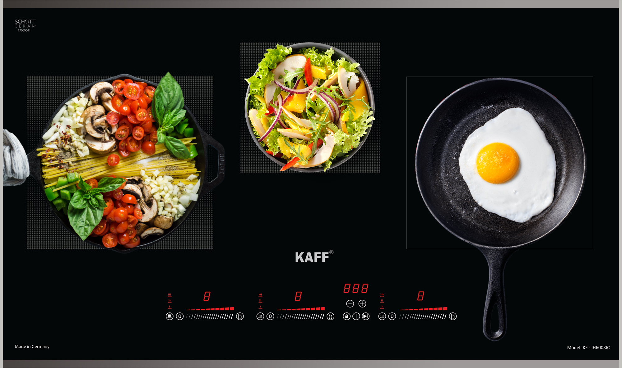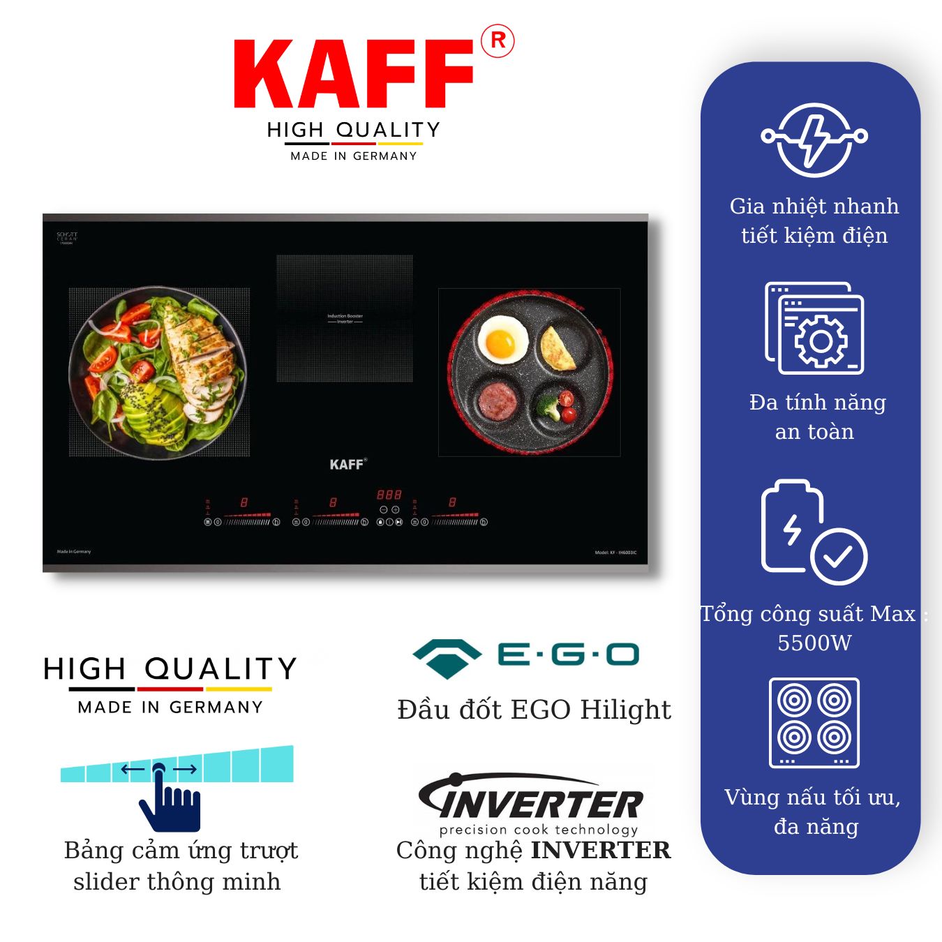 Mua tại TiktokBẾP ĐIỆN TỪ KẾT HỢP KAFF KF - IH6003IC MADE IN GERMANY Việt Nam Bếp sẽ mang đến cho gia đình bạn một gian bếp đẳng cấp với sản phẩm Bếp điện từ kết hợp KF-IH6003IC sở hữu thiết kế sang trọng, hiện đại mang đến cho gia đình bạn một gian bếp đẳng cấp. Mặt kính SCHOTT CE.RAN chịu nhiệt, chịu lực siêu việt, bảng điều khiển vùng nấu riêng biệt cảm ứng trượt hiện đại, phù hợp với mọi loại nồi chảo, tích hợp các tính năng khóa trẻ em, tự động ngắt điện khi quá nhiệt giúp tiết kiệm điện năng, nhanh chóng và đảm bảo an toàn tối đa. Bếp còn được trang bị bo mạch cung cấp bởi EGO bền bỉ và an toàn, tăng tuổi thọ bếp.